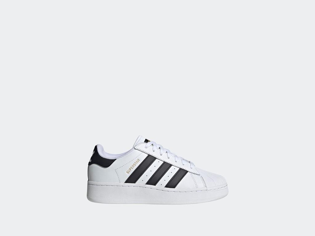 Die neue Silhouette ist sich dabei in den wesentlichen Merkmalen selbst treu geblieben und hat alle typischen Features, die wir vom Superstar kennen und lieben. Der brandneue Superstar XLG verfügt dabei über ein Upper aus Leder, eine EVA-Einlegesohle, eine erhöhte Plateau-Laufsohle und trägt eine überarbeitete Version der typischen muschelförmigen Toe Box aus Gummi.