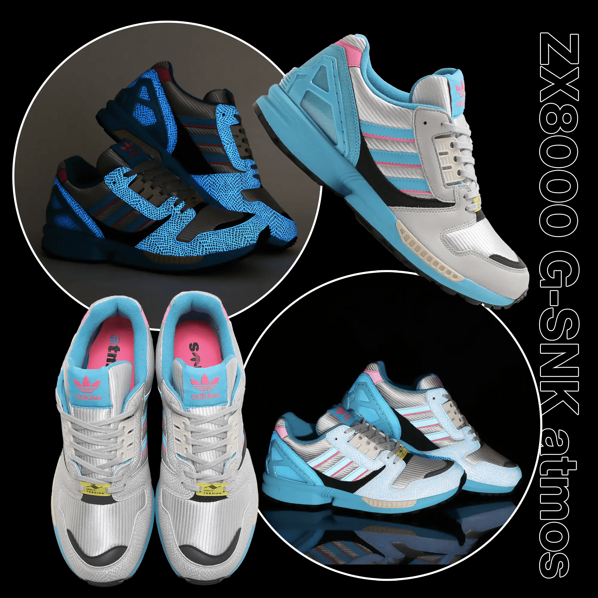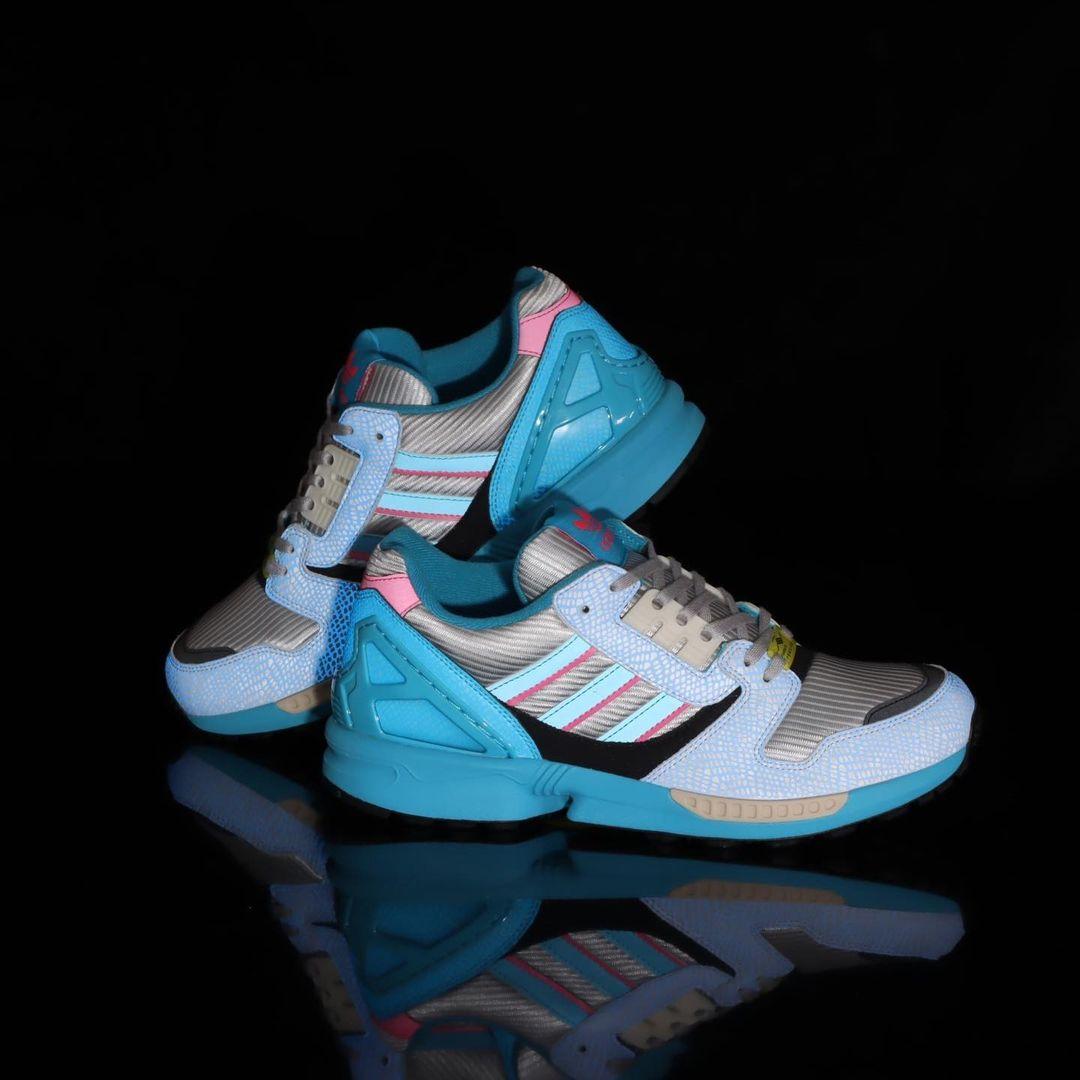 Das Obermaterial des adidas x atmos ZX8000 G-SNK "TJ" ist hauptsächlich Grau und hat türkise und rosafarbene Details. Die graue Toe Box ist aus atmungsaktivem Mesh gefertigt. Das Besondere: Bei Dunkelheit erkennt man auf den Overlays ein türkisfarbenes G-Sunk-Schlangenmuster.