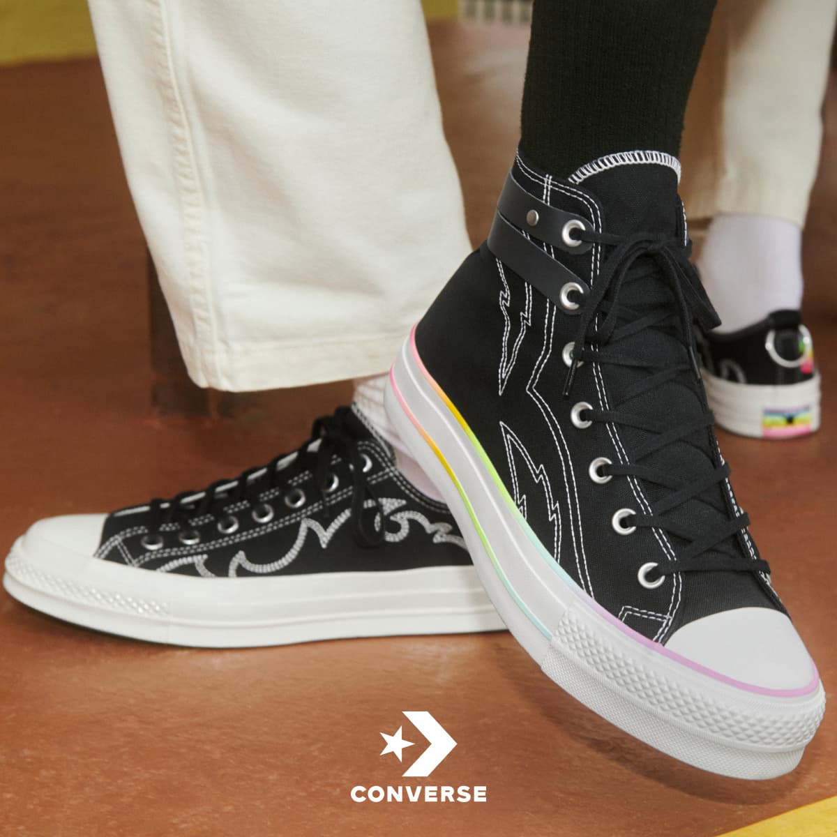Wir sehen dabei einige einzigartige Designdetails auf Modellen wie der Run Star Utility Scandal XC Silhouette, die beispielsweise mit einer Transgender-Flagge kommt. Oder der Chuck 70 mit einem platinfarbenen Obermaterial und einer vom Harnisch inspirierten Verzierung. Darüber hinaus bietet die Kollektion auch Western-Stickereien, visuelle Chuck-Aufnäher, neonfarbene Regenbogen-Laufsohlen und vieles mehr.