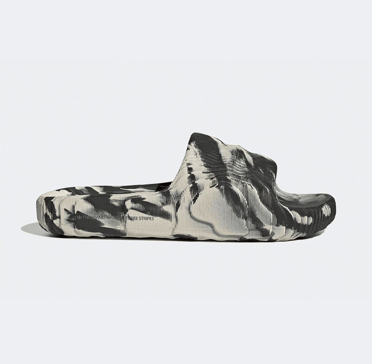 Die Adilette 22 kommt nun auch noch in einer schwarzen und einer weißen Farbgebung. Dieses Designs haben auch, wie die vorherigen, ein schlichtes Obermaterial. Bei den beiden sind die Farben kombiniert und die Slides haben ein meliertes Muster. Eine Colorway kombiniert die Farben Schwarz und Off-White und das andere Paar hat ein gepunktetes Muster mit den Farben 'Magic Lime' und 'Desert Sand'.