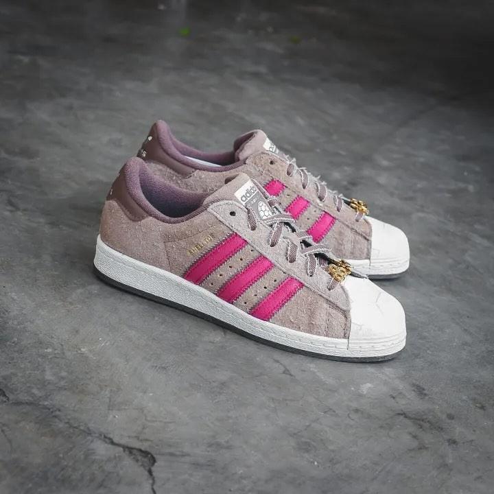 Der TMNT x adidas Superstar 'Master Splinter' ist aus robustem Wildleder mit rosa Three Stripes gefertigt, die an Splinters charakteristische Farben erinnern. Schildkrötenmotive zieren die Zunge, während die von der Franchise inspirierten Einlegesohlen für einen einzigartigen Touch sorgen. Das Wappen von Splinter wird elegant auf goldenen Schnürsenkeln präsentiert und rundet das Design ab.