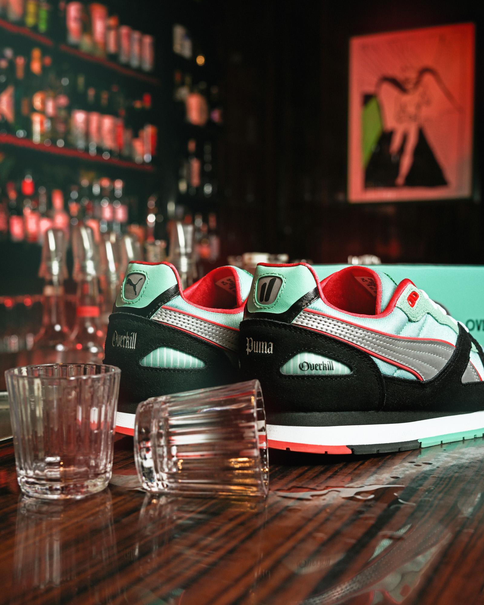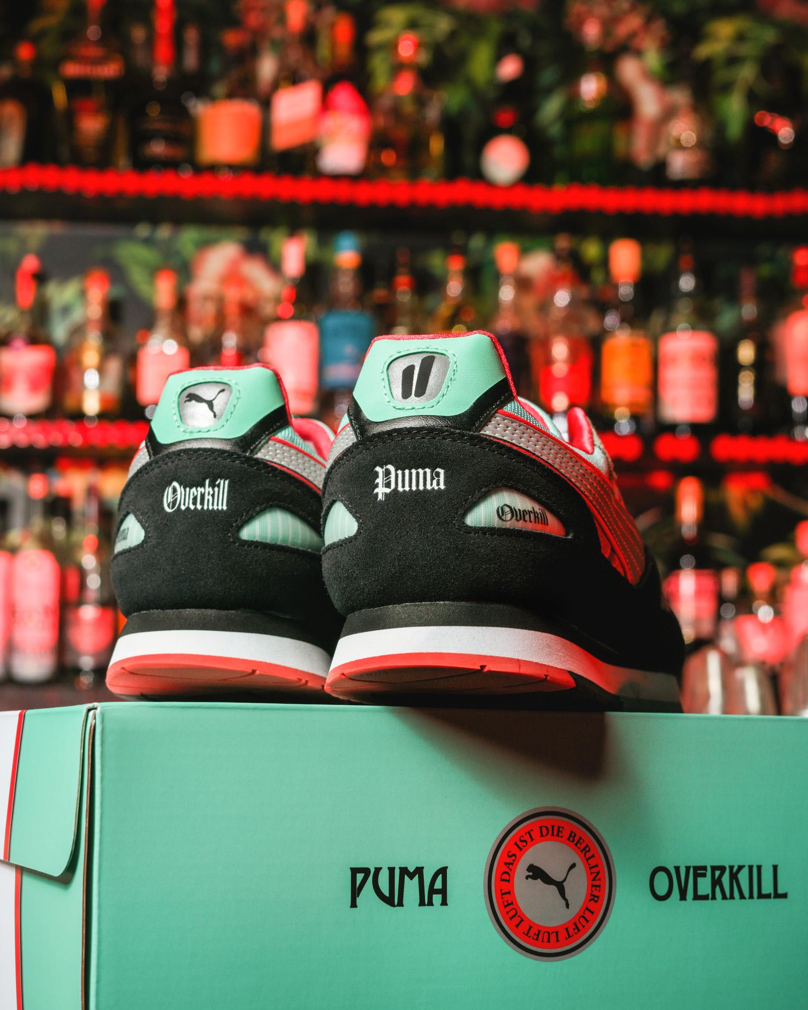 Die klassischen Modelle PUMA XS 7000 und Mirage OG wurden für die Kollaboration verwendet. Der XS 7000 hat eine auffällige mintgrüne Farbe erhalten und ist wie sein Vorgänger von der Berliner Luft inspiriert. Das Obermaterial kombiniert die Materialien Mesh, Leder und Wildleder. Die Ferse ist mit Puma- und Overkill-Branding versehen.