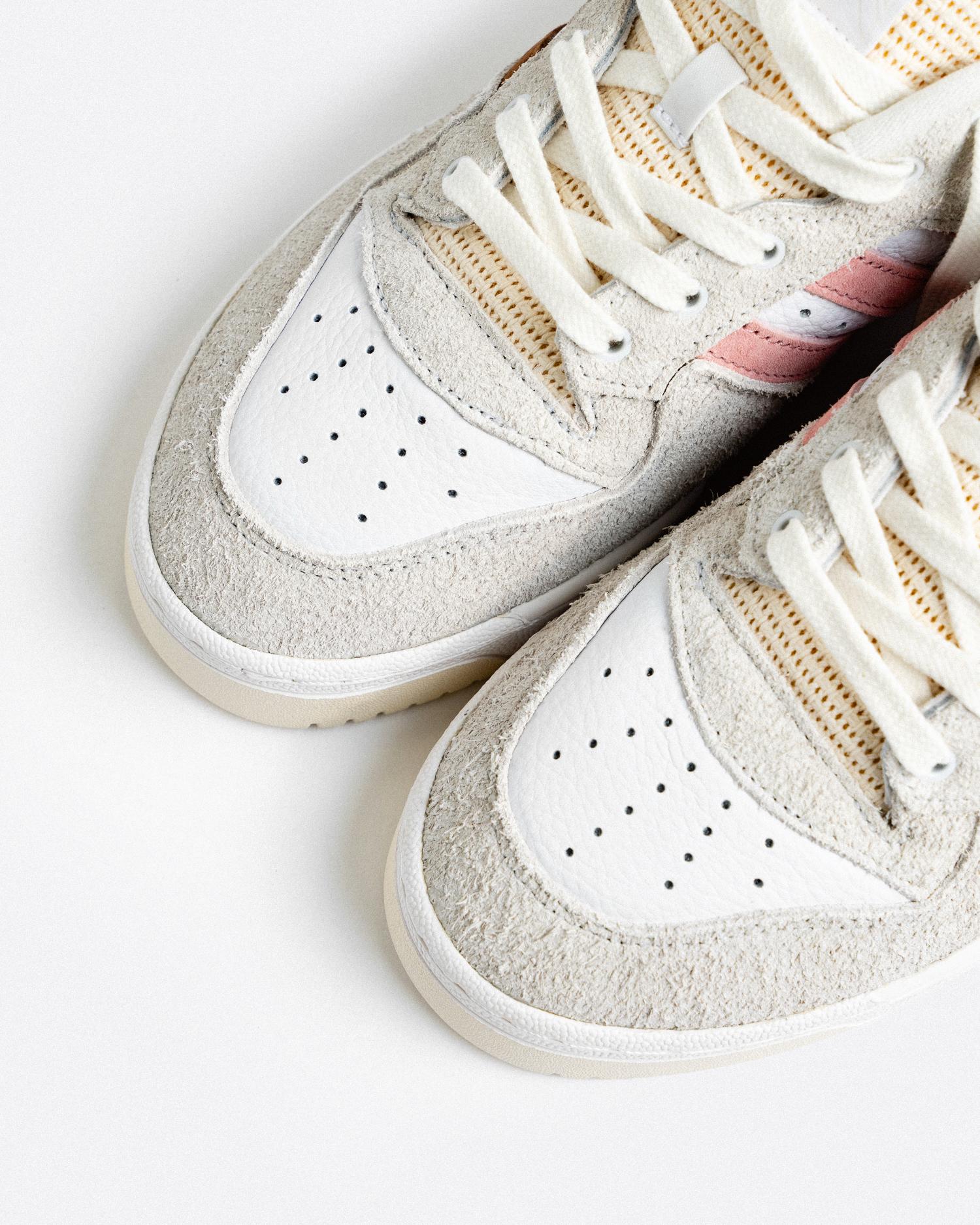 Die Farbpalette dieses Sneakers ist direkt von der klassischen neapolitanischen Eiscreme inspiriert, die traditionell aus Vanille, Schokolade und Erdbeere besteht. Das Obermaterial besteht hauptsächlich aus weißem Leder, das mit grauen Wildleder-Overlays kontrastiert.