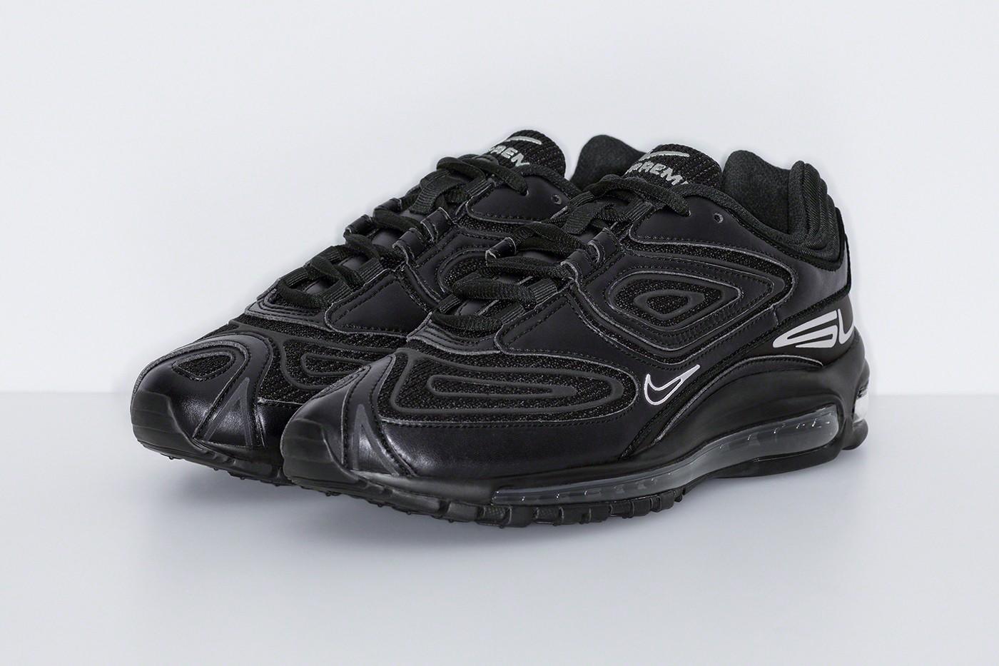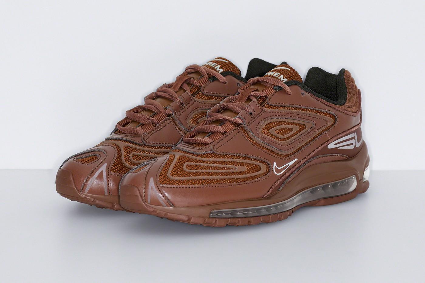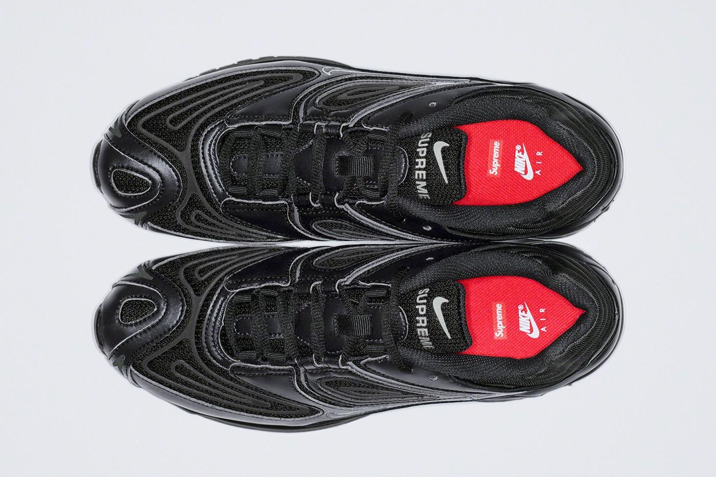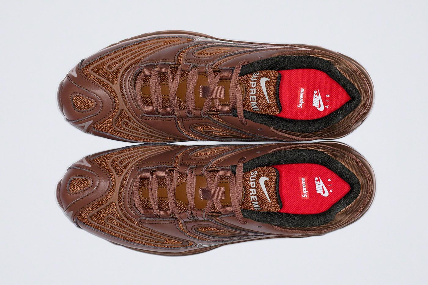 Das Co-Branding befindet sich auf der Zunge, während die Seite des Schuhs natürlich mit Swooshes versehen ist. Um das Design zu vervollständigen, ist der "SUPREME"-Schriftzug um die Fersenlasche gewickelt, darunter befinden sich Nike TL-Badges. Der Sneaker ist in 4 verschiedenen Farben erhältlich, schwarz, weiß, braun und pink.