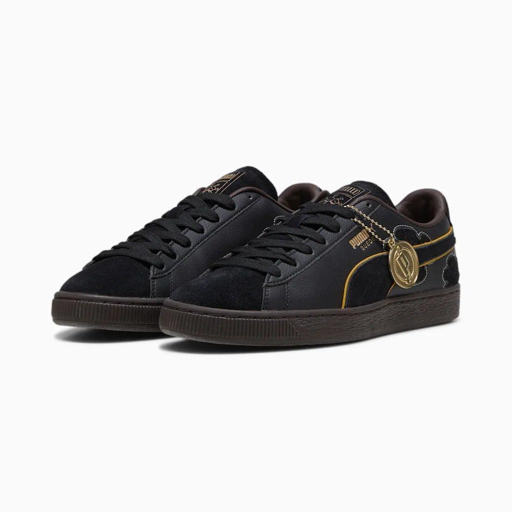 Of course, the One Piece x PUMA Suede collection also includes a 'Blackbeard' version. The black leather base is finished with gold accents. These refer to Emperor Blackbeard's coat and jewelry. Also on this sneaker, the tongue is decorated with a three-headed Jolly Roger. The tongue, logo, and cloud accents are rendered in the design, referring to his dark powers.