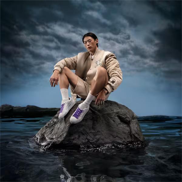 The first One Piece x PUMA Suede colorway we see is a white performance sneaker that highlights Luffy's Fifth Gear white hair. In this awakened form, Luffy is often depicted with clouds floating around him.