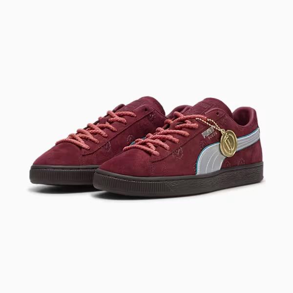 The next colorway to compliment the One Piece x PUMA Suede is the 'Shanks' version. This wine-red sneaker is perhaps the most detailed and honors Emperor Shanks. It is only fitting that there are two Jolly Rogers on the tongue of the sneaker, as he is the leader of the Red Hair Pirates. His three iconic scars are also stitched on the heel of the sneaker.