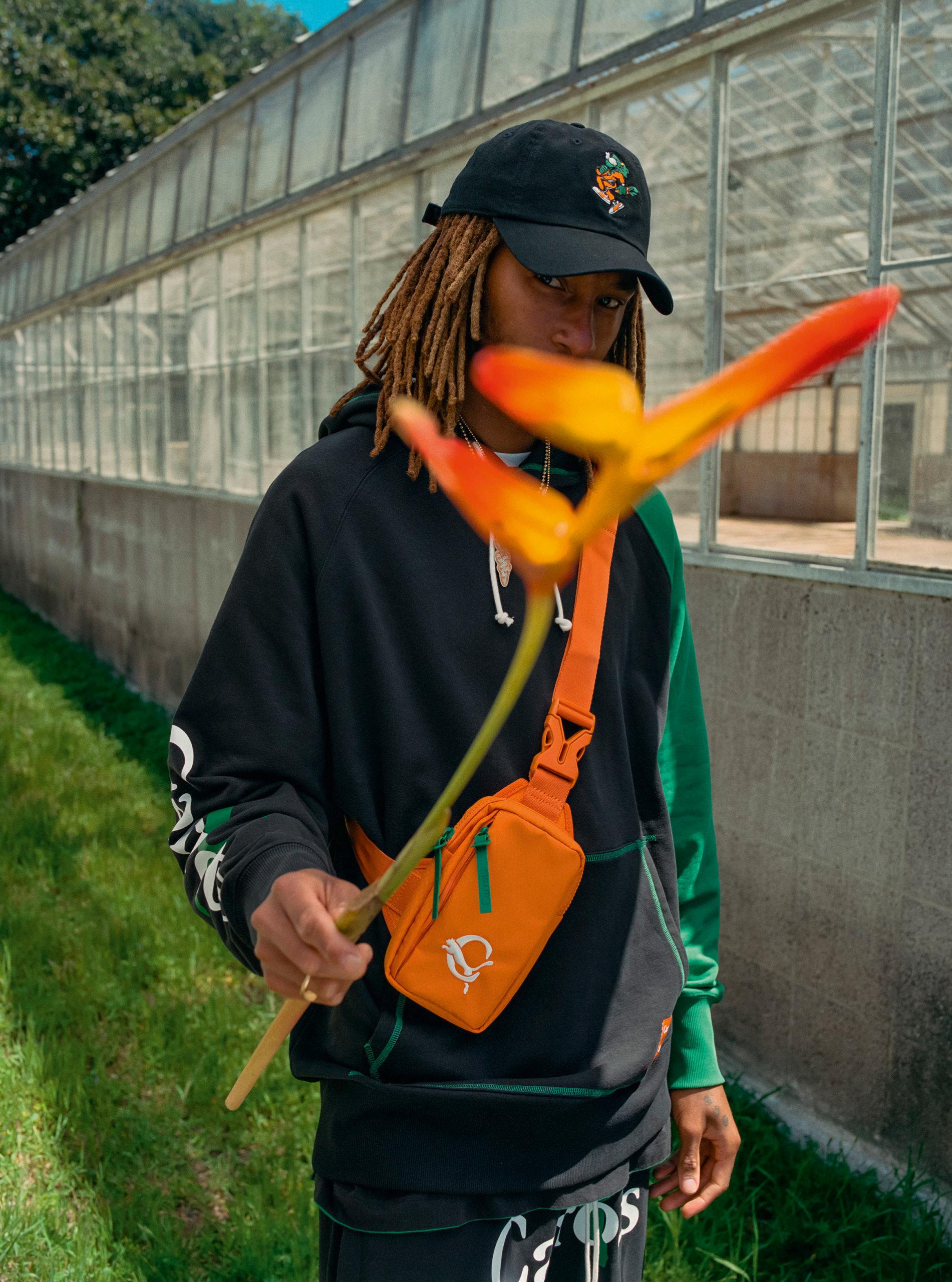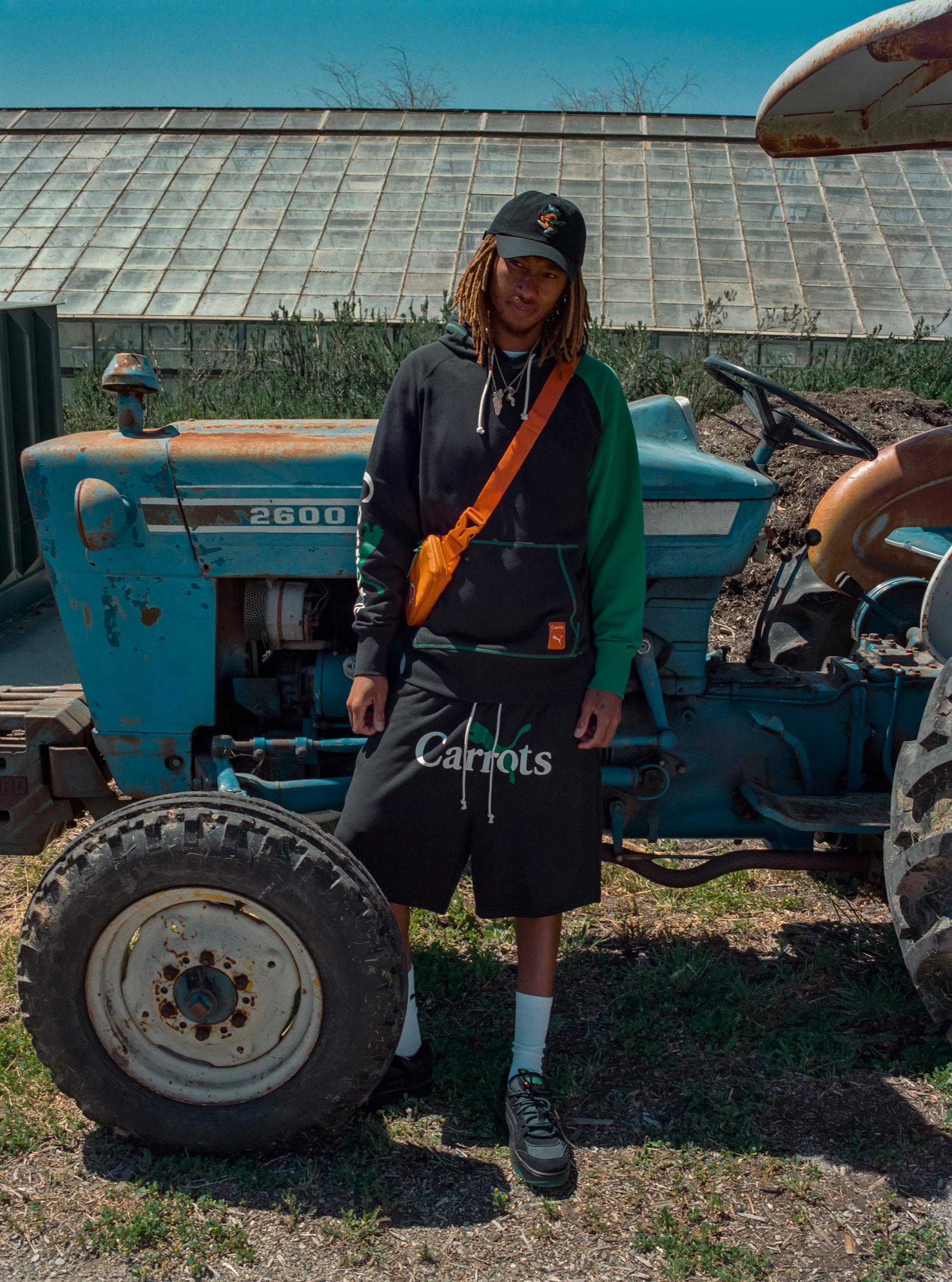 The clothing collection consists of cut-and-sewn items such as a hoodie and shorts. We also see a rugby shirt passing by, as well as a graphic tee, a cap, and a waistbag. Like the sneakers, the collection combines Carrots and PUMA logos in orange and shades of green.