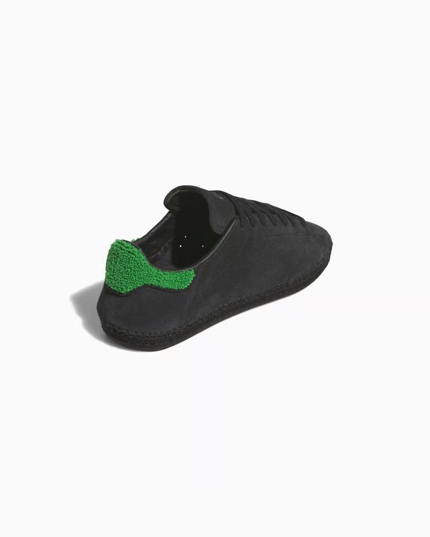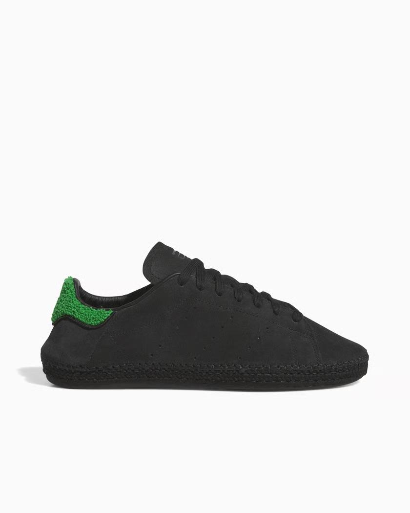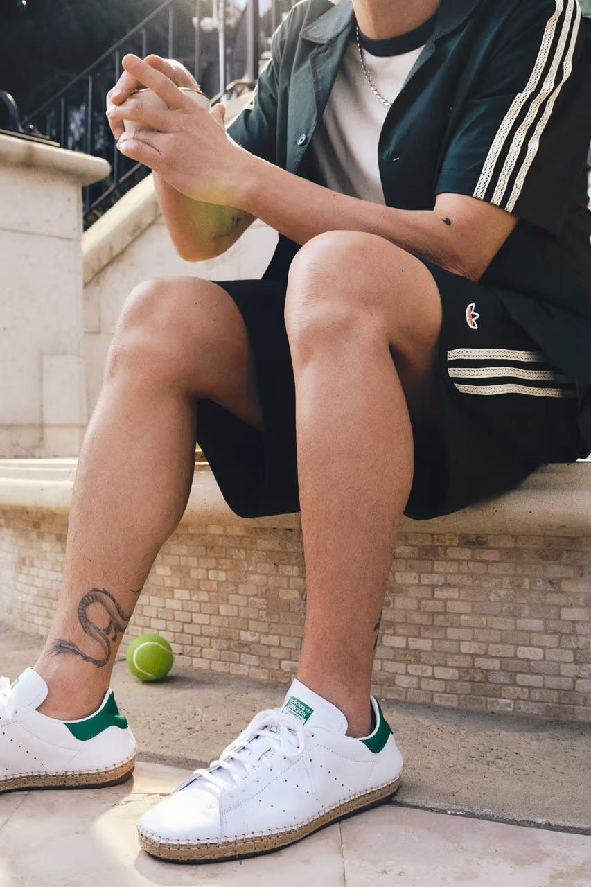 This collaboration reimagines the classic tennis shoe with an espadrille-inspired midsole. Two colorways will be available, one in 'Footwear White' and the other in 'Cloud Black' with green and black. The white version sticks closely to the original Stan Smith look, featuring a smooth leather build. The black version opts for a textured upper with suede overlays and a more jute-inspired construction.
