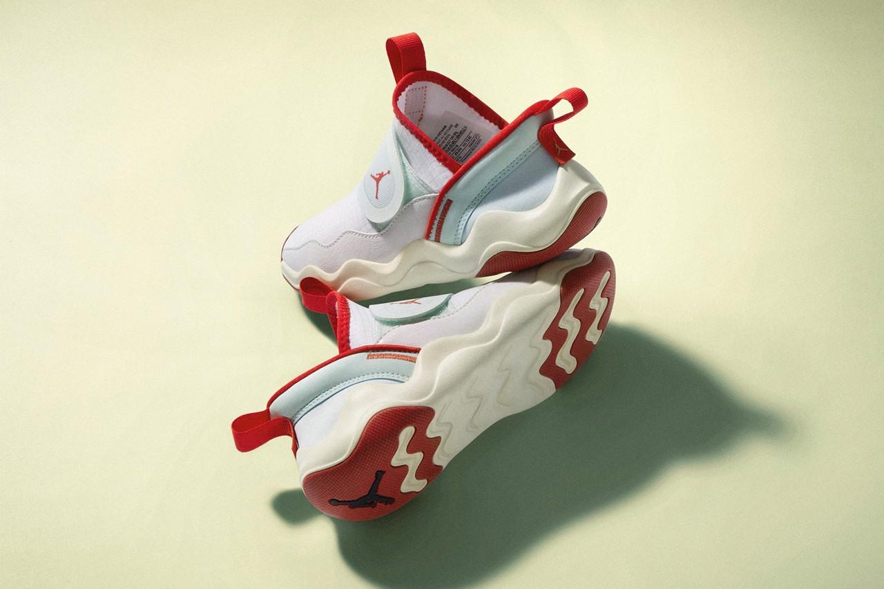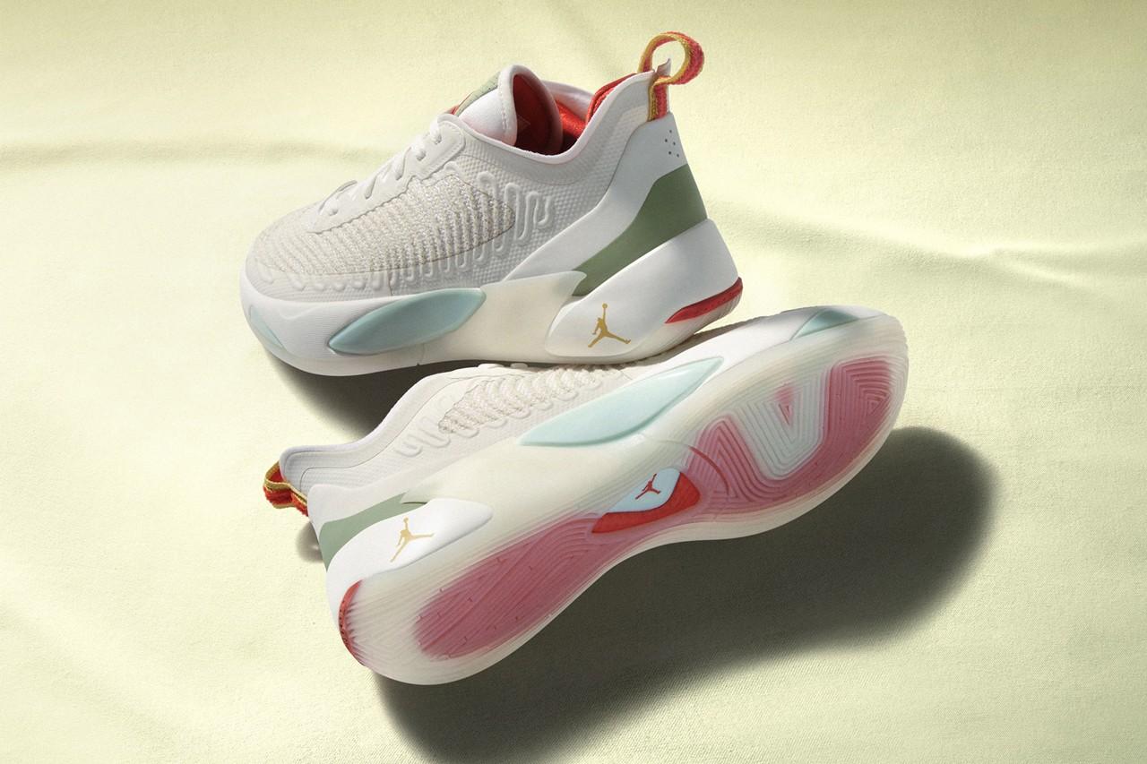 The Air Jordan 1 Elevate Low is coloured white with pastel green overlays. The Nike Air logo is red and contrasts nicely with the rest of the upper. We also see an Air Jordan Legacy 312, Jordan Luka 1, Air Jordan 37, Air Jordan 23, Jordan 23/7, Air Jordan 1 High Zoom CMFT 2 and a Jordan Series .05 returning to the collection. The sneakers all share the same shades in which red accents take centre stage.