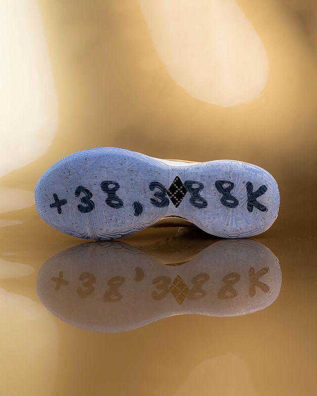 The luxurious materials and gold details are more than fitting for King James. For the shoe is mainly made of crocodile leather and is all about luxury. Think accents, such as the Swoosh and various references to milestones of LeBron's career, cast in gold. Also, the record of 38,388 points is boldly printed on the outsole.