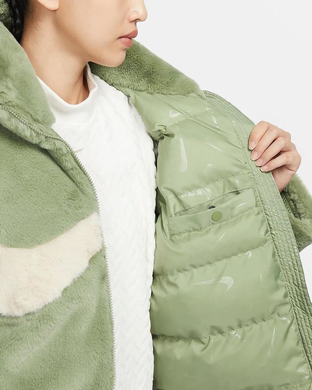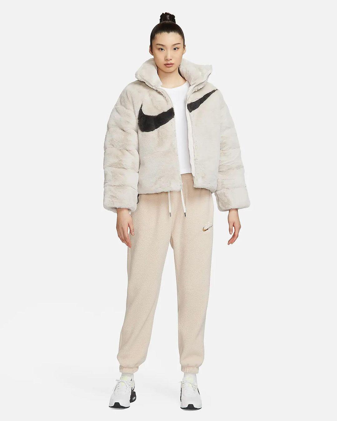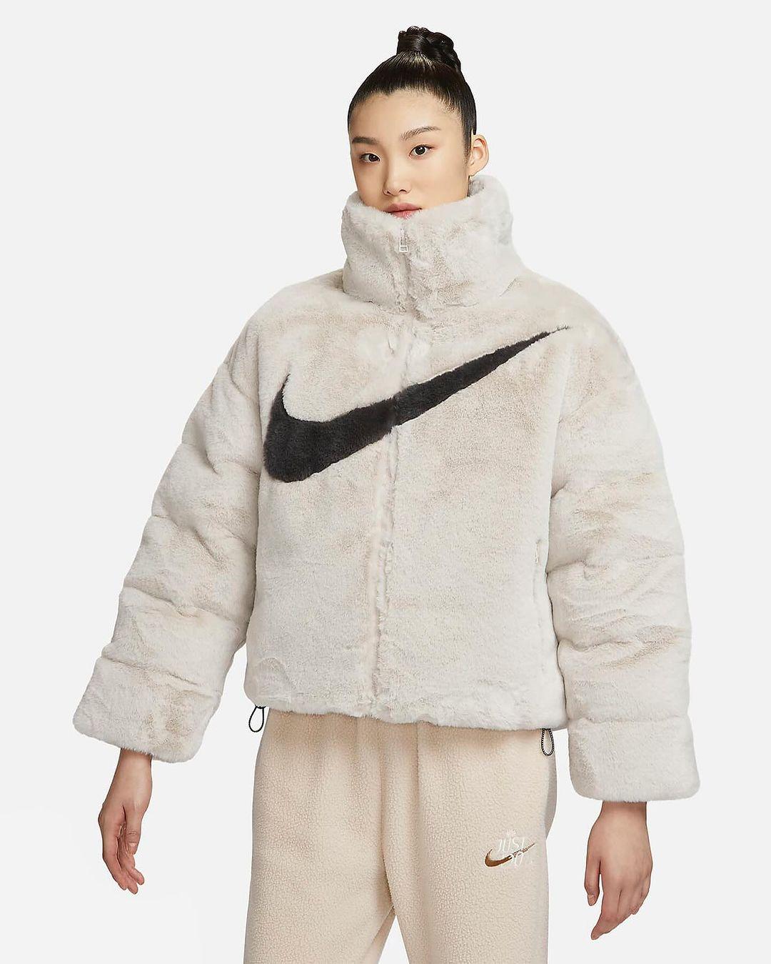Nike is packing big this winter. Recently, the first images of a faux fur puffer jacket with the Big Swoosh on the front appeared. The Big Swoosh has appeared on viral fleece blanket, handbag and faux fur jacket in the past. Check out the official images of the Nike puffer jacket here.
