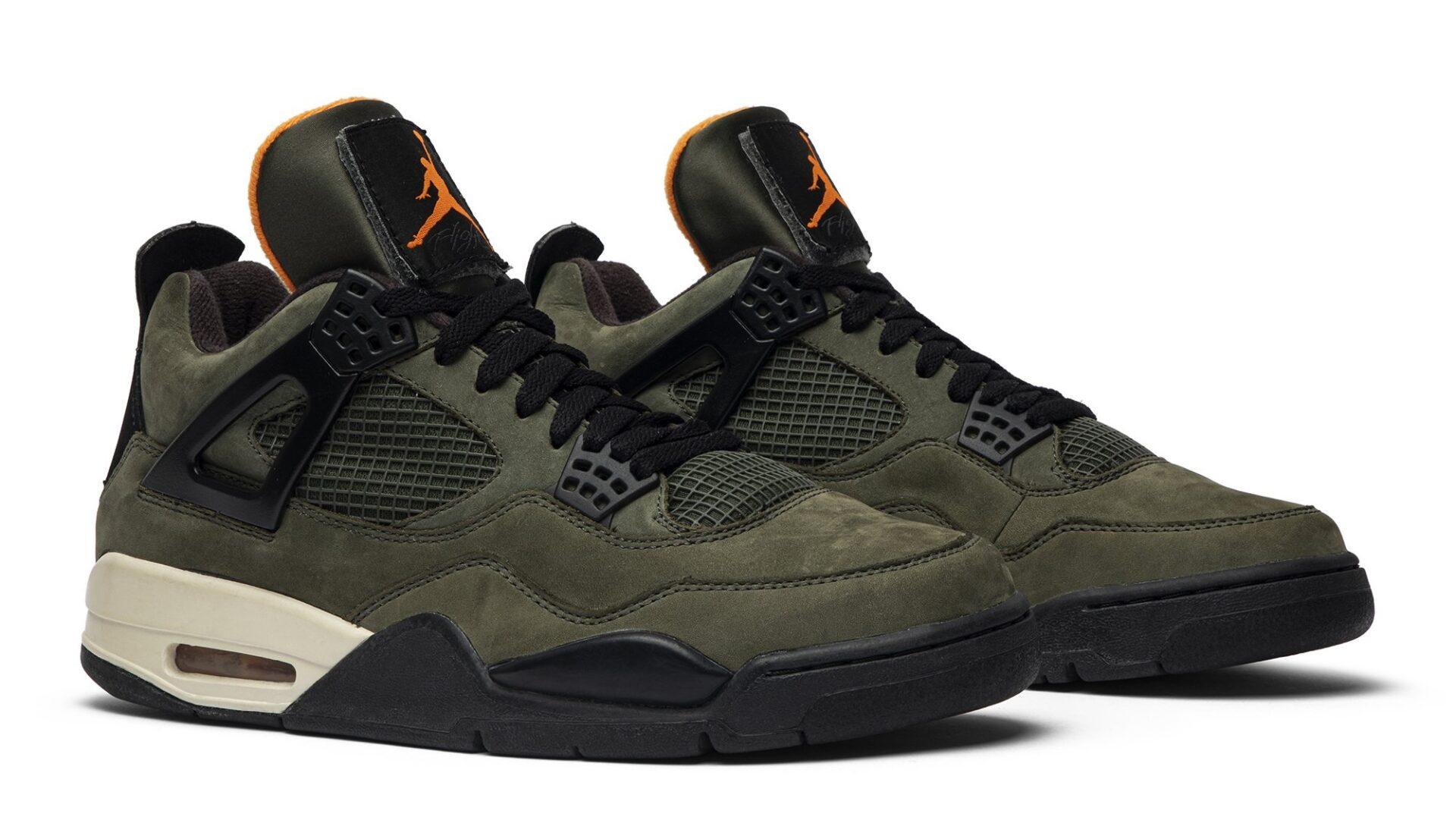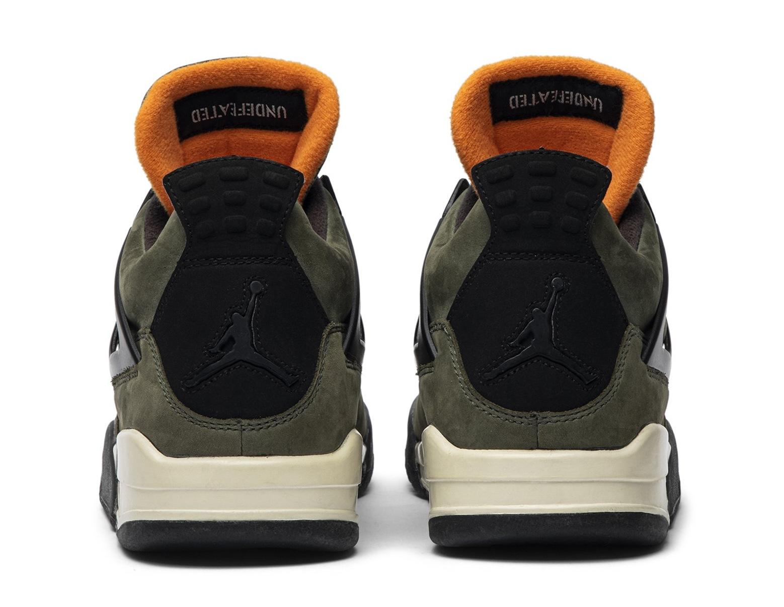The UNDEFEATED x Air Jordan 4 takes inspiration from MA-1 Flight jackets designed for U.S. Air Force and Navy pilots. The 2025 release remains close to its predecessor but has some tweaks. The re-release appears to use a darker shade of green. The upper has a mesh construction. Orange elements and the UNDFTD logo on the inside of the tongue complete the sneaker.