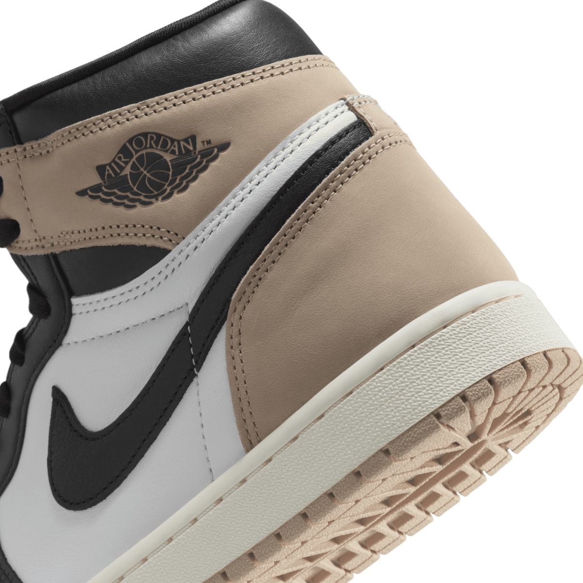 De volgende sneaker uit de Jordan lijn is de Air Jordan 1 High OG ‘Latte’. De sneaker verschijnt in de welbekende ‘Black-toe’ samenstelling. Het bovenwerk is van wit leer. Over de upper zijn zwarte en lichtbruine overlays geplaatst die de sneaker een strakke look geven. Op de hiel is het Wing logo geplaatst.