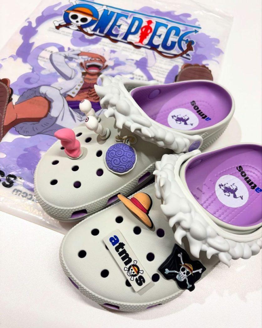 De knipoog naar One Piece gaat verder met herkenbare Jibbitz-charms, zoals Luffy’s strohoed, de paarse duivelsvrucht en de iconische zwarte piratenvlag. Cartoonachtige ogen en een aangepaste atmos-logo in One Piece-stijl maken het geheel af.