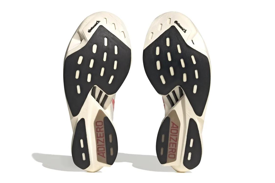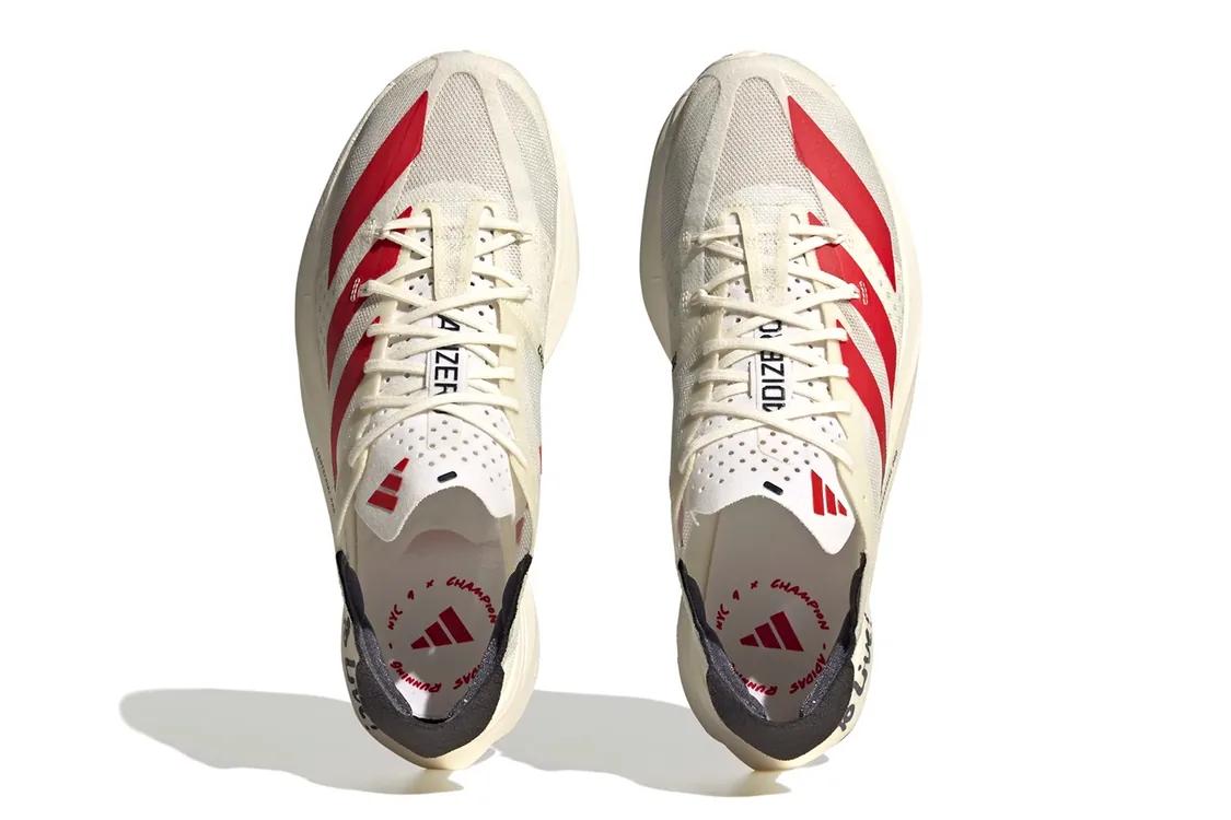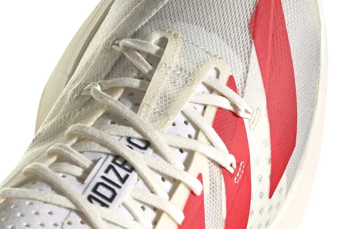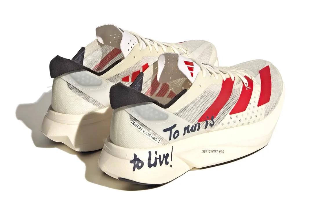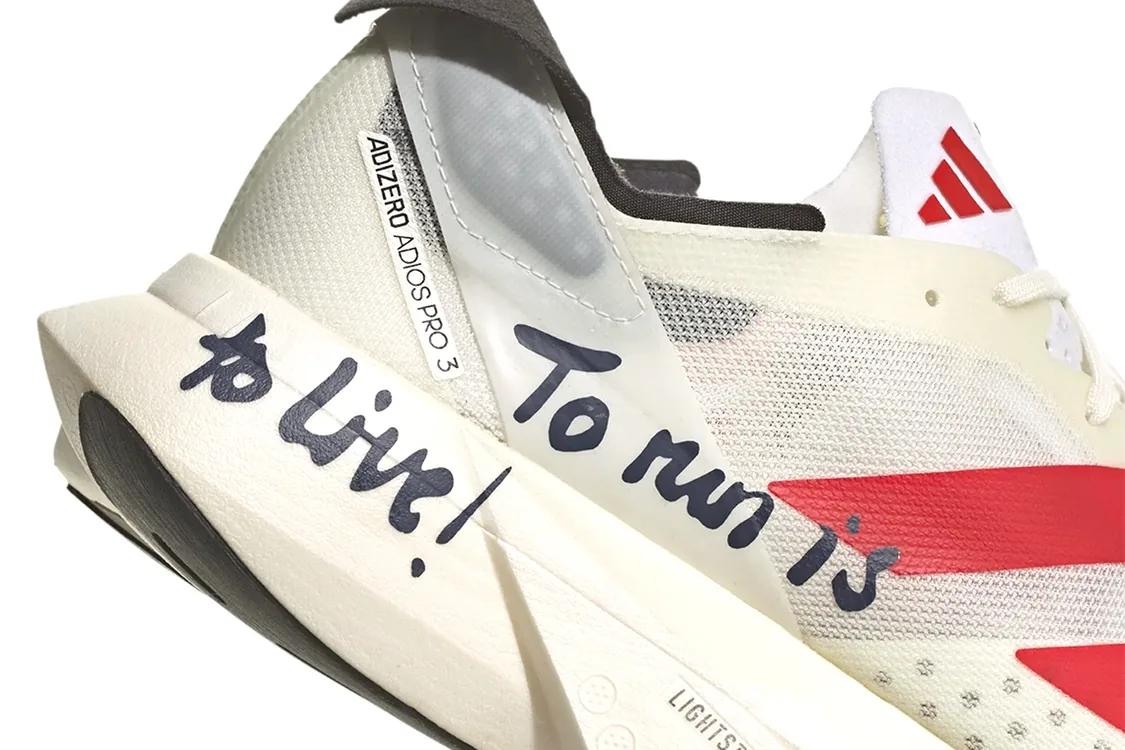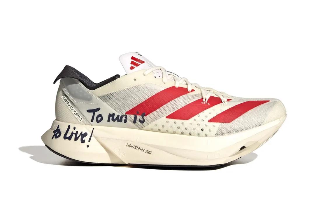 Naast het technische gedeelte van de schoen heeft de ADIZERO Adios Pro 3 ‘To run is to live’ een clean en simpel design, voornamelijk in een sail white colorway met rode en zwarte accenten. De tekst ‘NYC 9x Champion’ staat op het ronde merk op de binnenzool. Het Adizero-logo staat onderop. Om de hardloopschoen af te maken, staat er ‘To run is to live!’ op de zijkant.