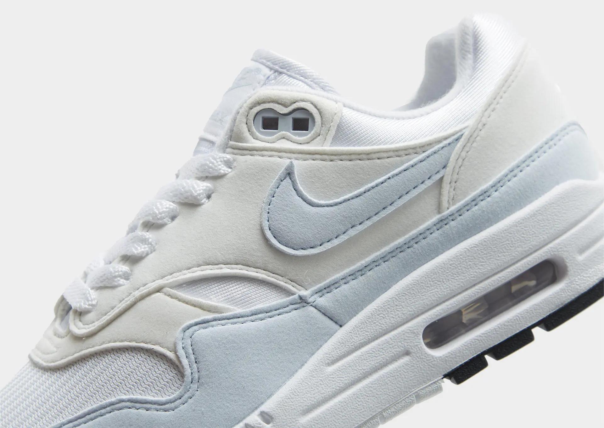 De Nike Air Max 1 ‘White Ice Blue’ doet denken aan de ‘Pure Platinum/Dark Obsidian’ colorway die hierboven is getoond. De sneaker komt met lichtblauwe overlays en heeft een frisse look. Leren en suède overlays geven het paar stevigheid. Ook deze colorway komt met klassieke Nike brandings.