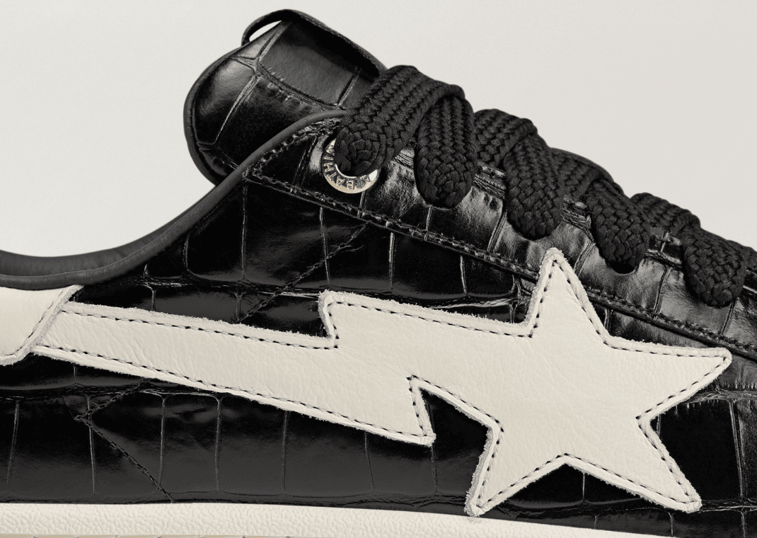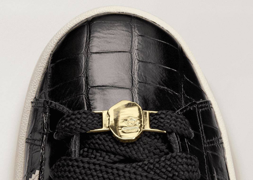 Als Nächstes folgt der BAPE x adidas Campus 00s. Für alle, die es etwas luxuriöser mögen, kommt der Campus 00s in edlem ‘Core Black’ Krokoleder. Ein klarer Verweis auf High-End-Streetwear, mit vergoldeten Details und wechselndem Branding. Auf der einen Seite die klassischen Three Stripes, auf der anderen der BAPE Star.