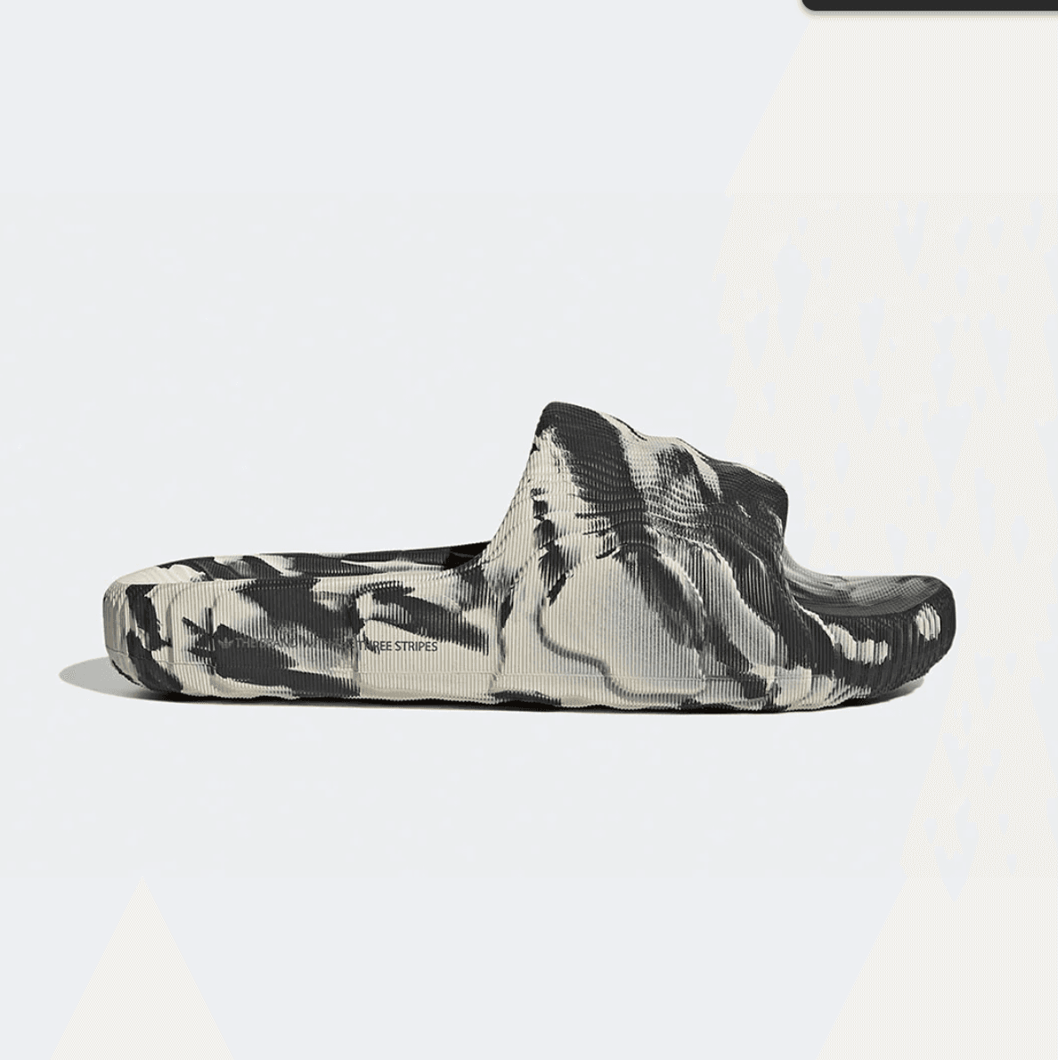 Die Adilette 22 kommt nun auch noch in einer schwarzen und einer weißen Farbgebung. Dieses Designs haben auch, wie die vorherigen, ein schlichtes Obermaterial. Bei den beiden sind die Farben kombiniert und die Slides haben ein meliertes Muster. Eine Colorway kombiniert die Farben Schwarz und Off-White und das andere Paar hat ein gepunktetes Muster mit den Farben 'Magic Lime' und 'Desert Sand'.