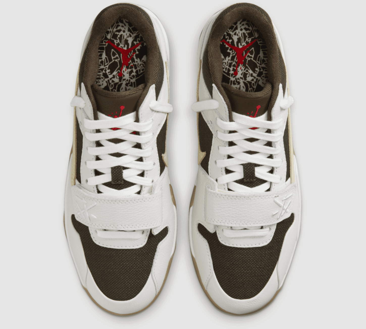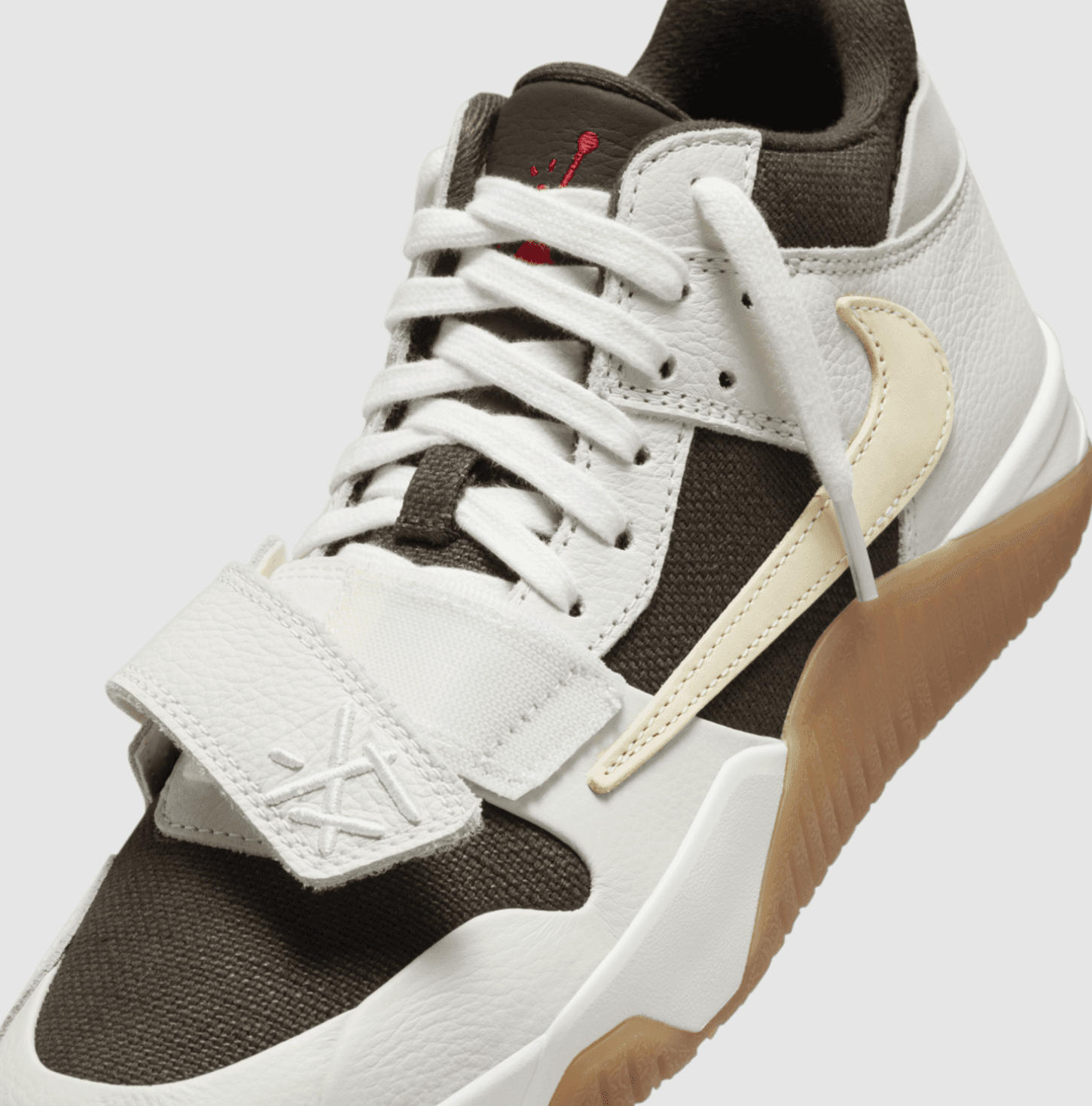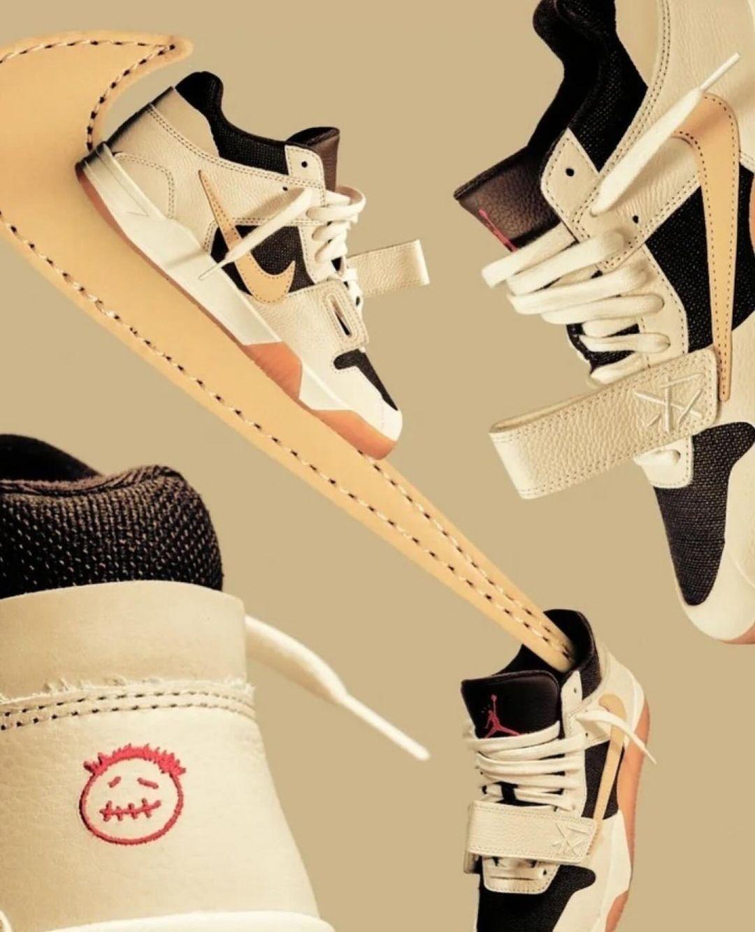 Weitere auffällige Merkmale sind der Riemen am Mittelfuß, die roten Jumpman-Logos auf der Zunge, der Cactus Jack-Smiley auf den Fersen und die "Jack"-Logos auf der Gummi-Außensohle. Nicht zu vergessen natürlich auch der ikonische umgekehrte Swoosh, der diesmal in einem cremefarbenen Design präsentiert wird.