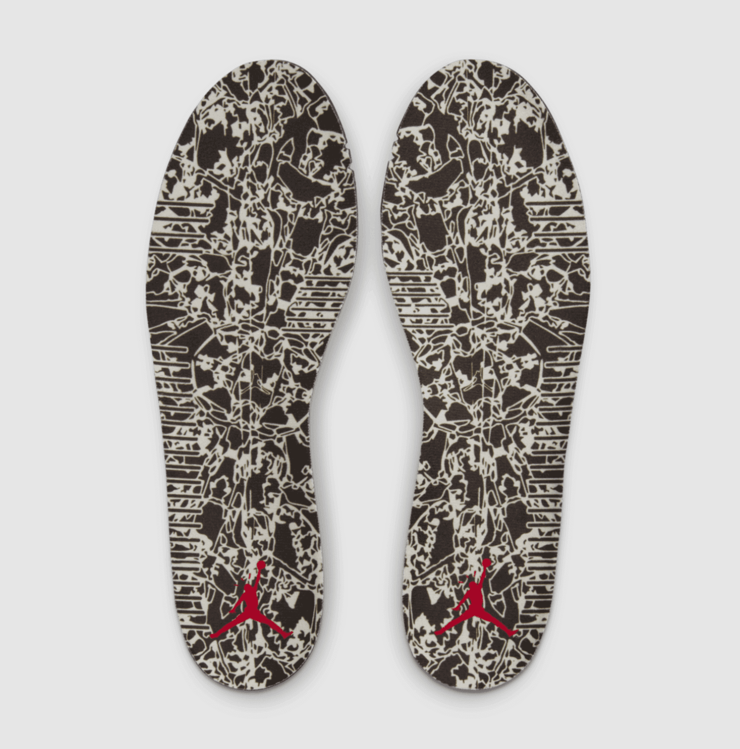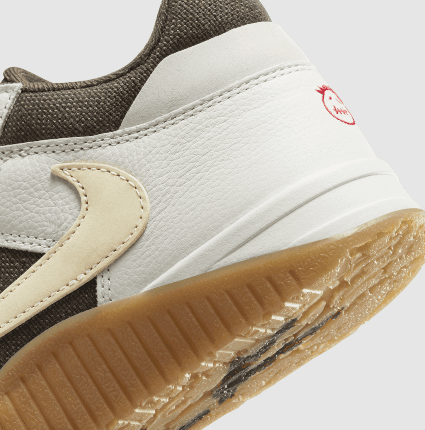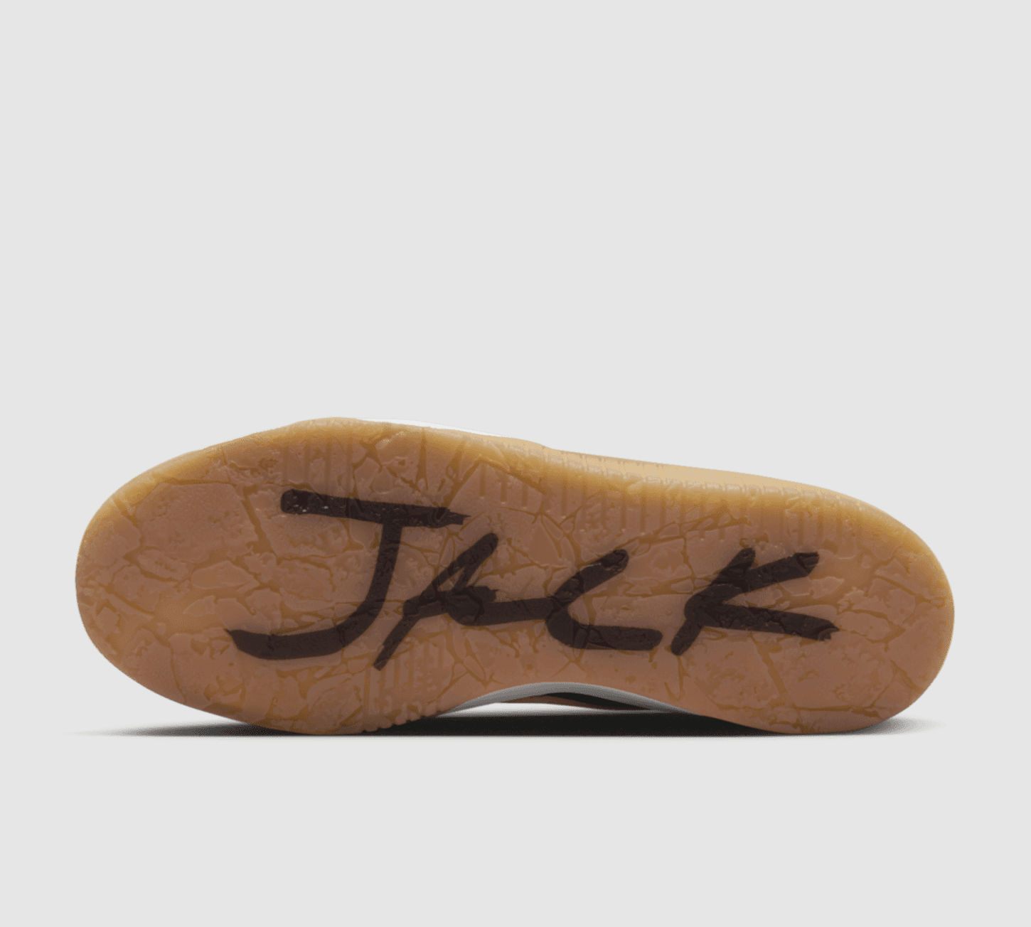 Weitere auffällige Merkmale sind der Riemen am Mittelfuß, die roten Jumpman-Logos auf der Zunge, der Cactus Jack-Smiley auf den Fersen und die "Jack"-Logos auf der Gummi-Außensohle. Nicht zu vergessen natürlich auch der ikonische umgekehrte Swoosh, der diesmal in einem cremefarbenen Design präsentiert wird.