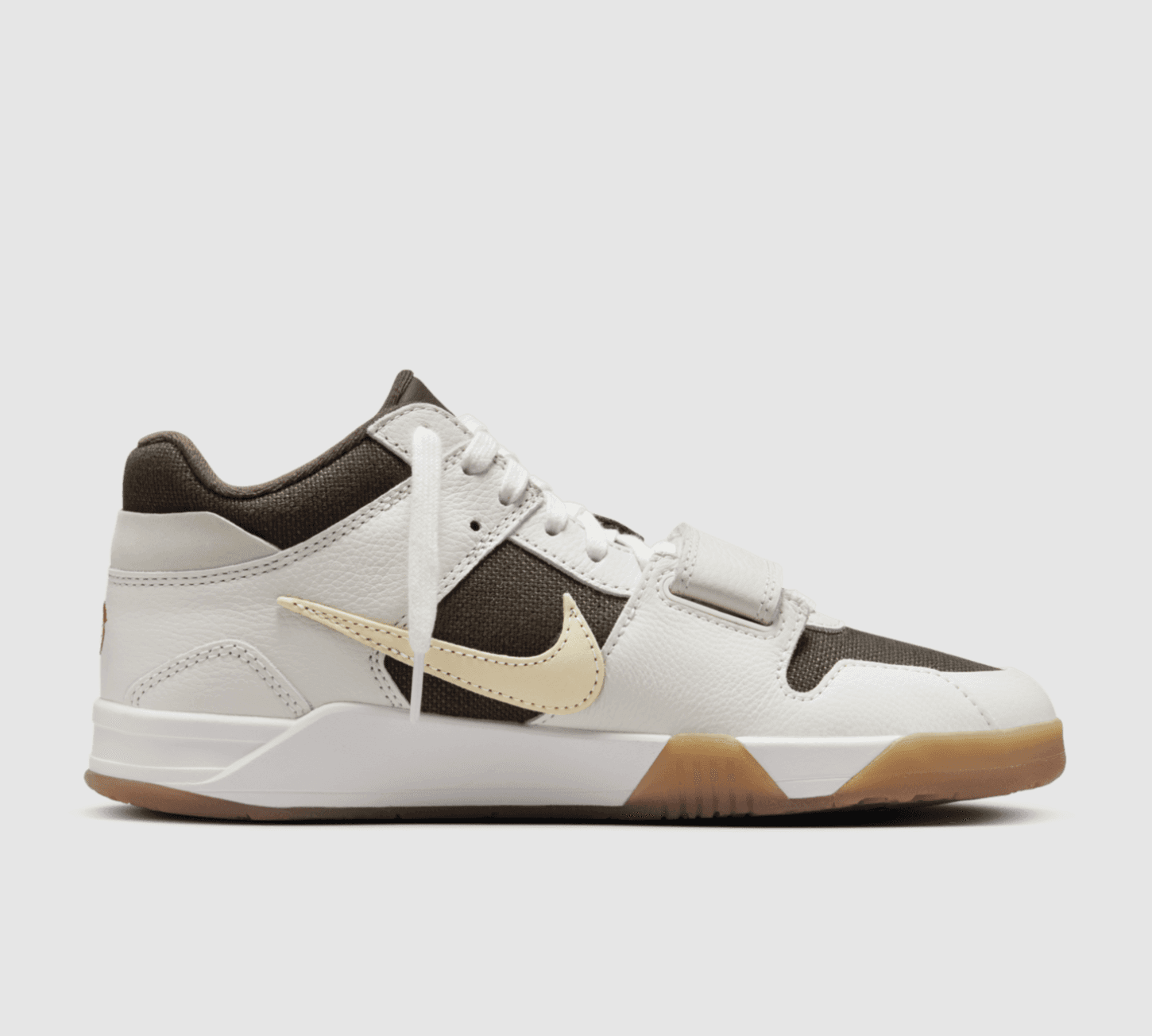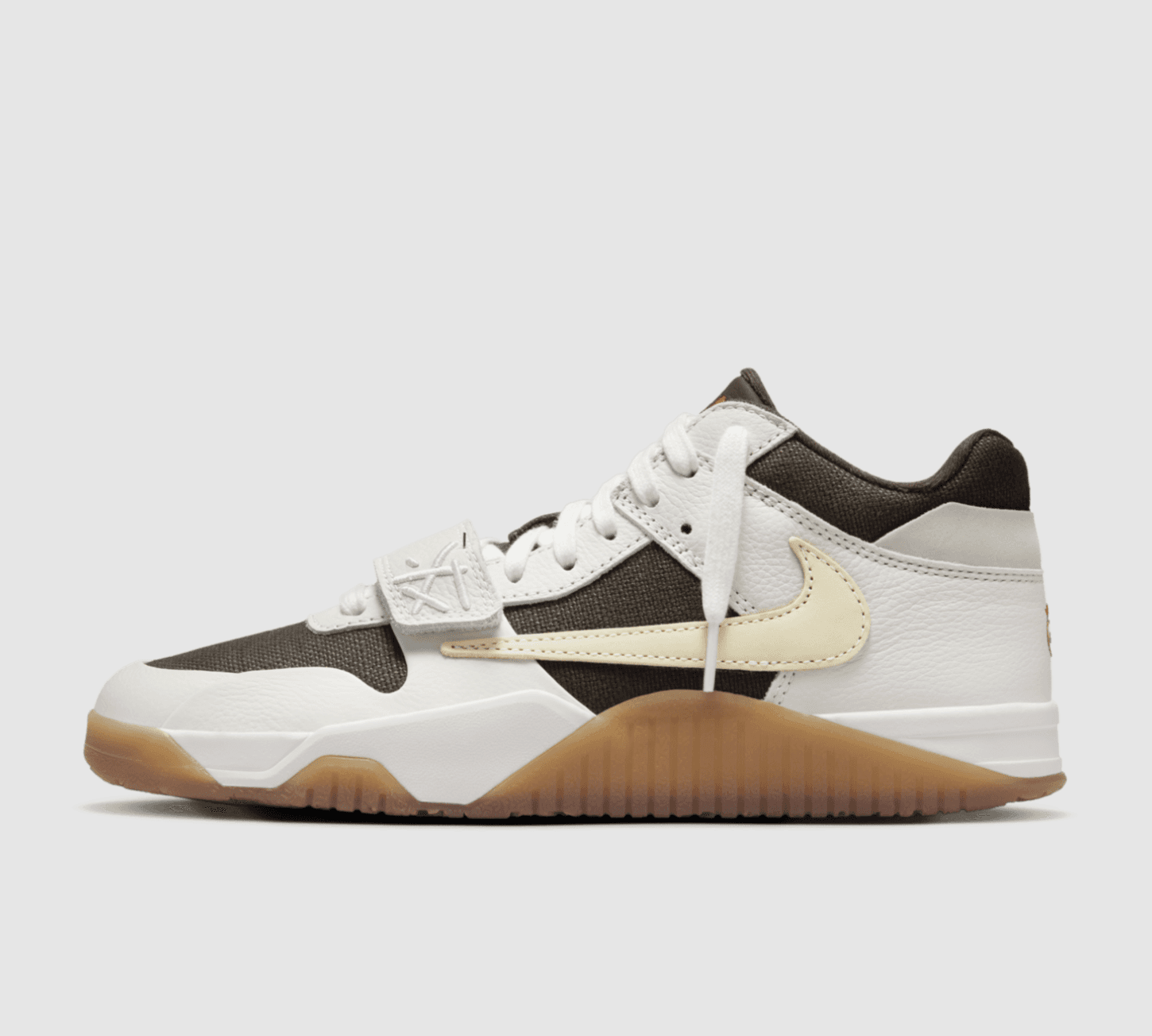Diese neue Silhouette von Travis Scott und der Jordan Brand hat ein braunes Mesh-Obermaterial, kombiniert mit getrommeltem Leder in Weiß und Sail auf den Overlays. Zusätzlich sind Wildlederdetails an der Ferse zu sehen.
