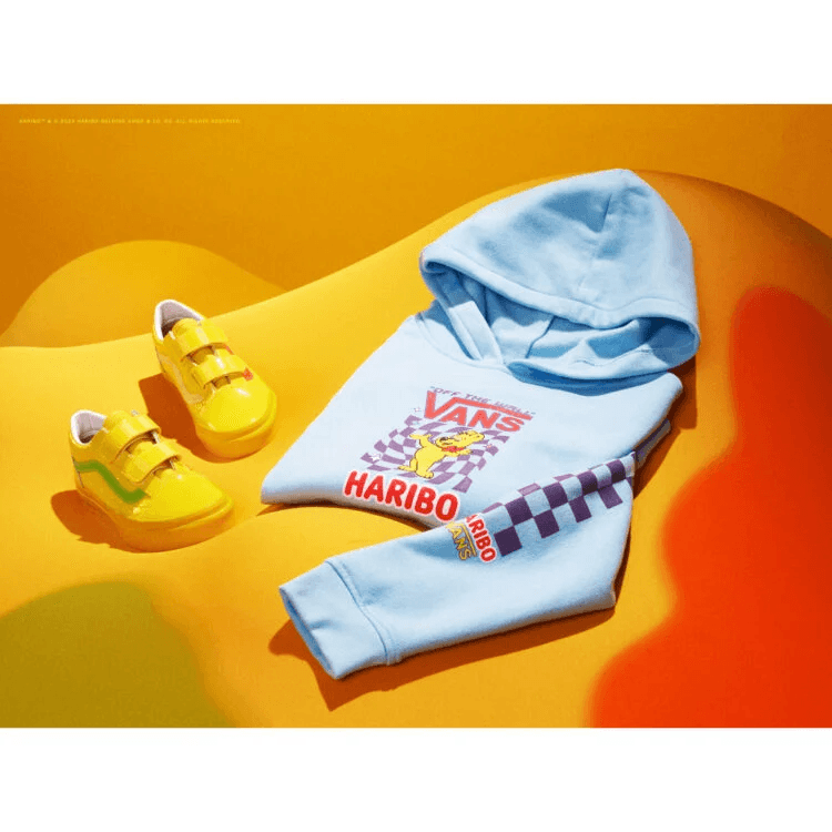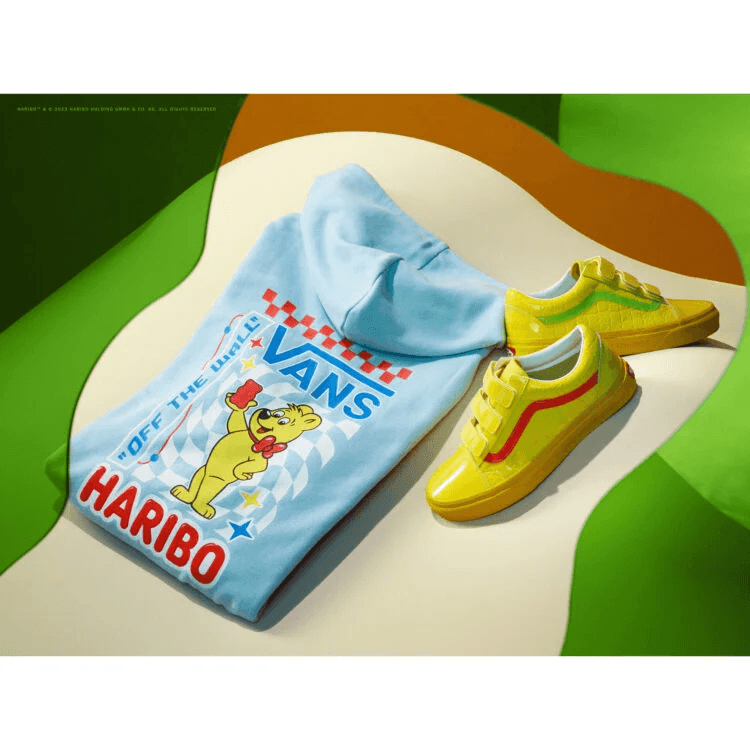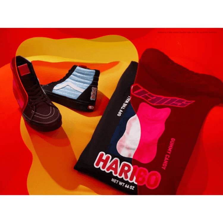Die Haribo x Vans-Kollektion umfasst eine ganze Reihe der kultigen Vans-Silhouetten wie den Sk8-Hi, Old Skool und Slip-On. Auf jedem der Pieces sehen wir Grafiken, die auf Haribo anspielen- zum Beispiel die Haribo Gummibärchen, Colaflaschen, Würmer und Kirschen. An anderer Stelle wird den bekannten Slogan von Haribo in zehn verschiedenen Sprachen.