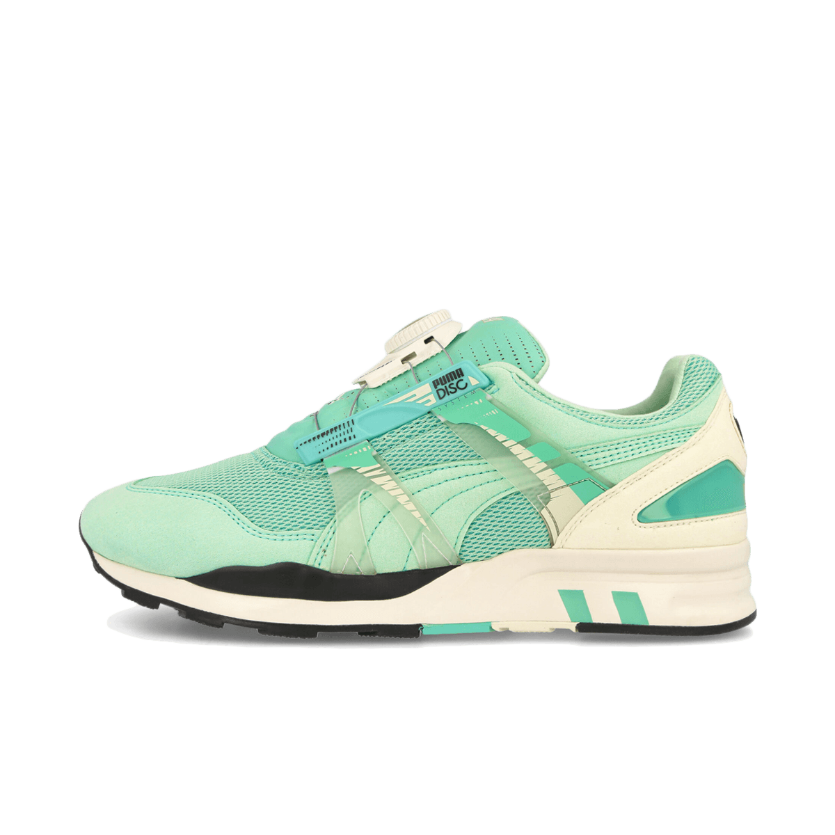 Das zweite Paar, der Mirage OG, kombiniert die Farben Schwarz, Mintgrün und Weiß. Das Obermaterial hat eine glänzende Oberfläche und die Overlays sind aus Wildleder und schwarz. Das PUMA-Logo befindet sich hier auf der Zunge und das Branding beider Marken ist in geschwungenen Buchstaben auf dem Absatz angebracht. Retro-Vibes dürfen bei den Designs auch nicht fehlen. Dazu sehen wir auch ein besonderes Packaging!