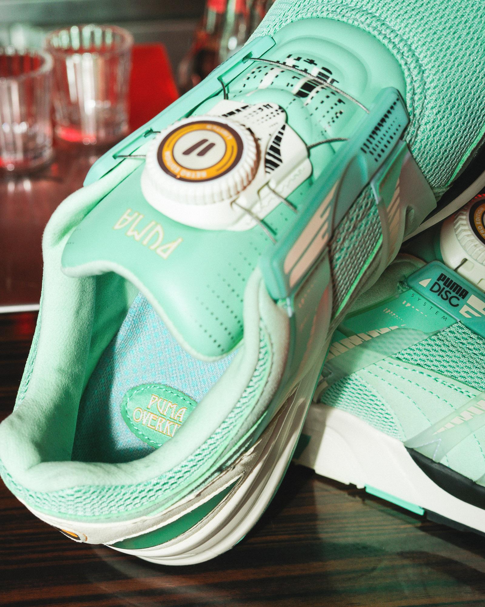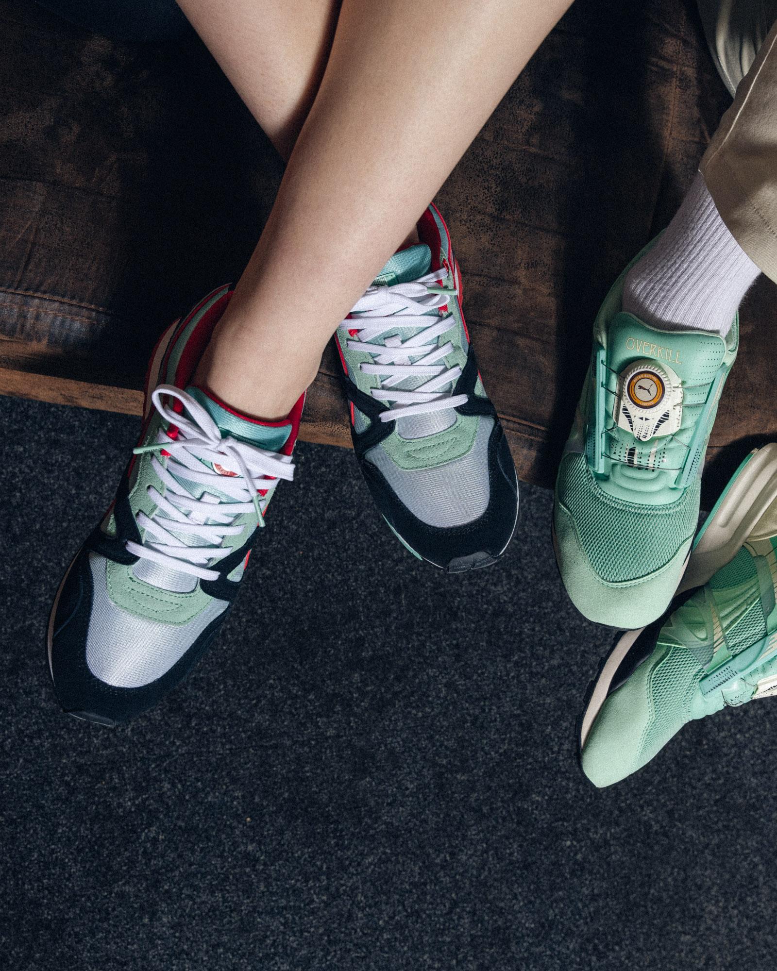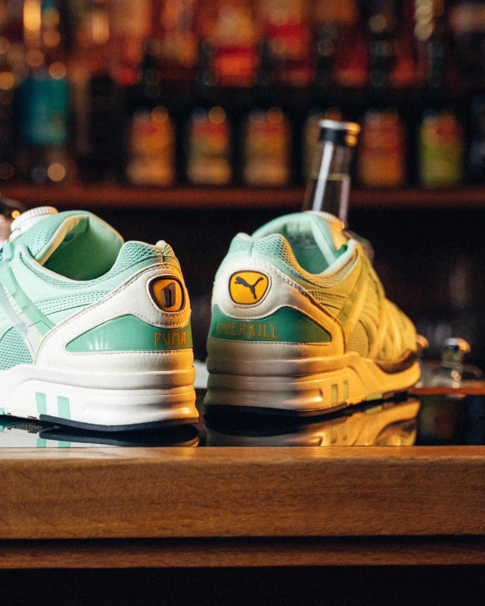 Die klassischen Modelle PUMA XS 7000 und Mirage OG wurden für die Kollaboration verwendet. Der XS 7000 hat eine auffällige mintgrüne Farbe erhalten und ist wie sein Vorgänger von der Berliner Luft inspiriert. Das Obermaterial kombiniert die Materialien Mesh, Leder und Wildleder. Die Ferse ist mit Puma- und Overkill-Branding versehen.