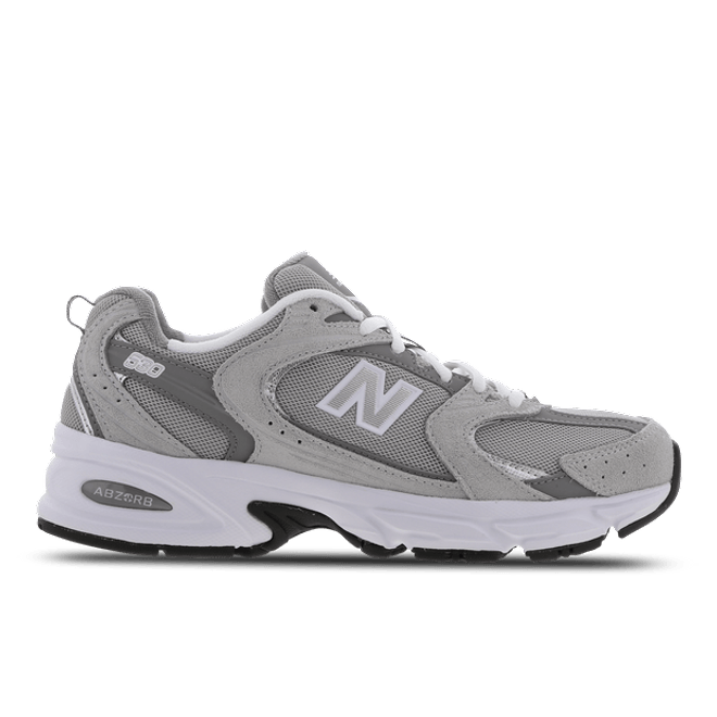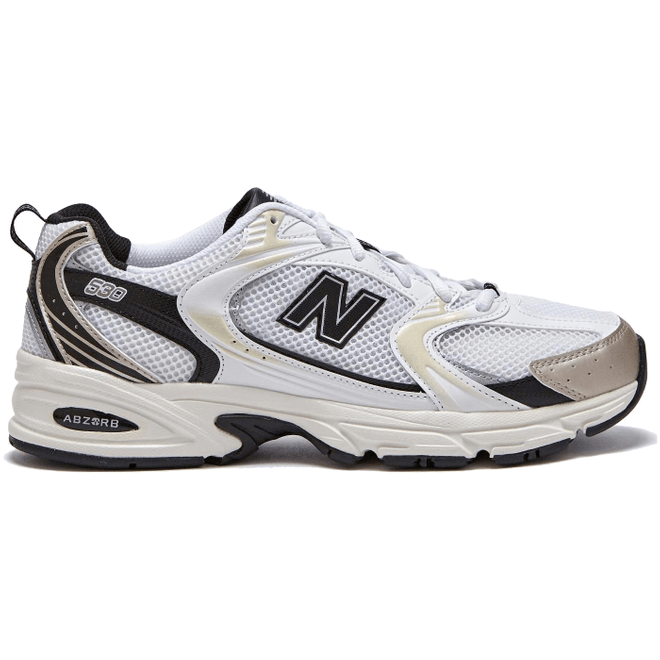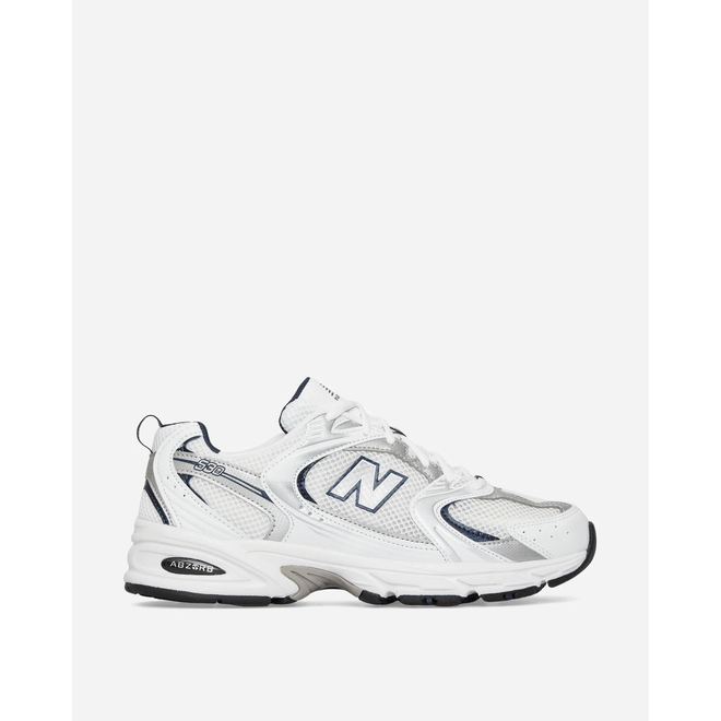 Der New Balance W MR530SG hat einen Retro-Look und kombiniert die Farben Weiß und Dunkelblau. Der Turnschuh hat ein Obermaterial aus Mesh und Leder-Overlays. An der Nase und an der Ferse sind silberne Details zu sehen. Diese verleihen dem Paar einen nostalgischen Twist. Auf der mittleren Platte sehen wir das N-Logo. An der Ferse ist die 530, das Modell des Schuhs, in Silber aufgedruckt.