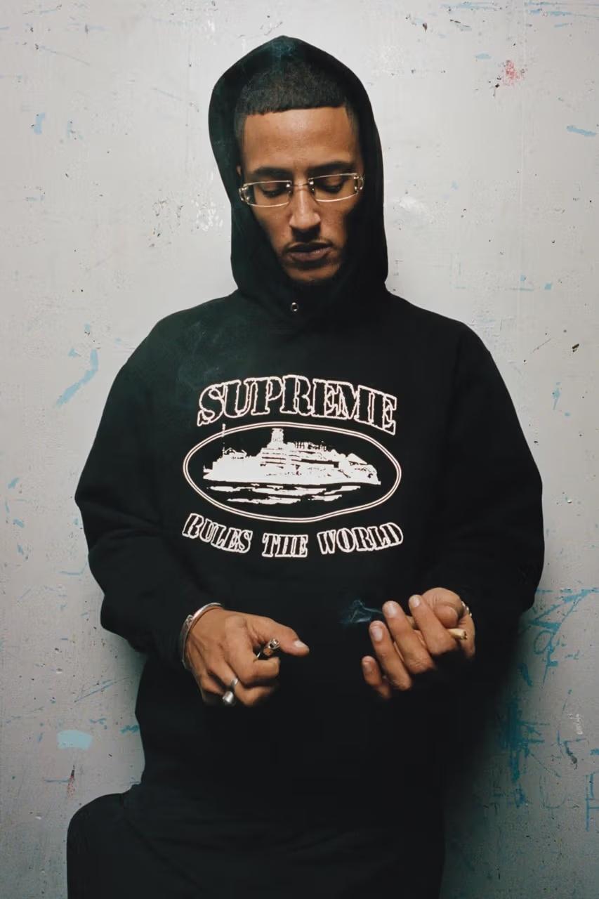 London-based brand Corteiz is teaming up with Supreme for the first time in 2024. In the past year, 2023, the brand has gained a lot of popularity following the release of three Corteiz x Nike Air Max 95 colorways. Recently, the first images of Corteiz x Supreme pop-ups featuring Corteiz's well-known quote 'Rules The World' appeared.