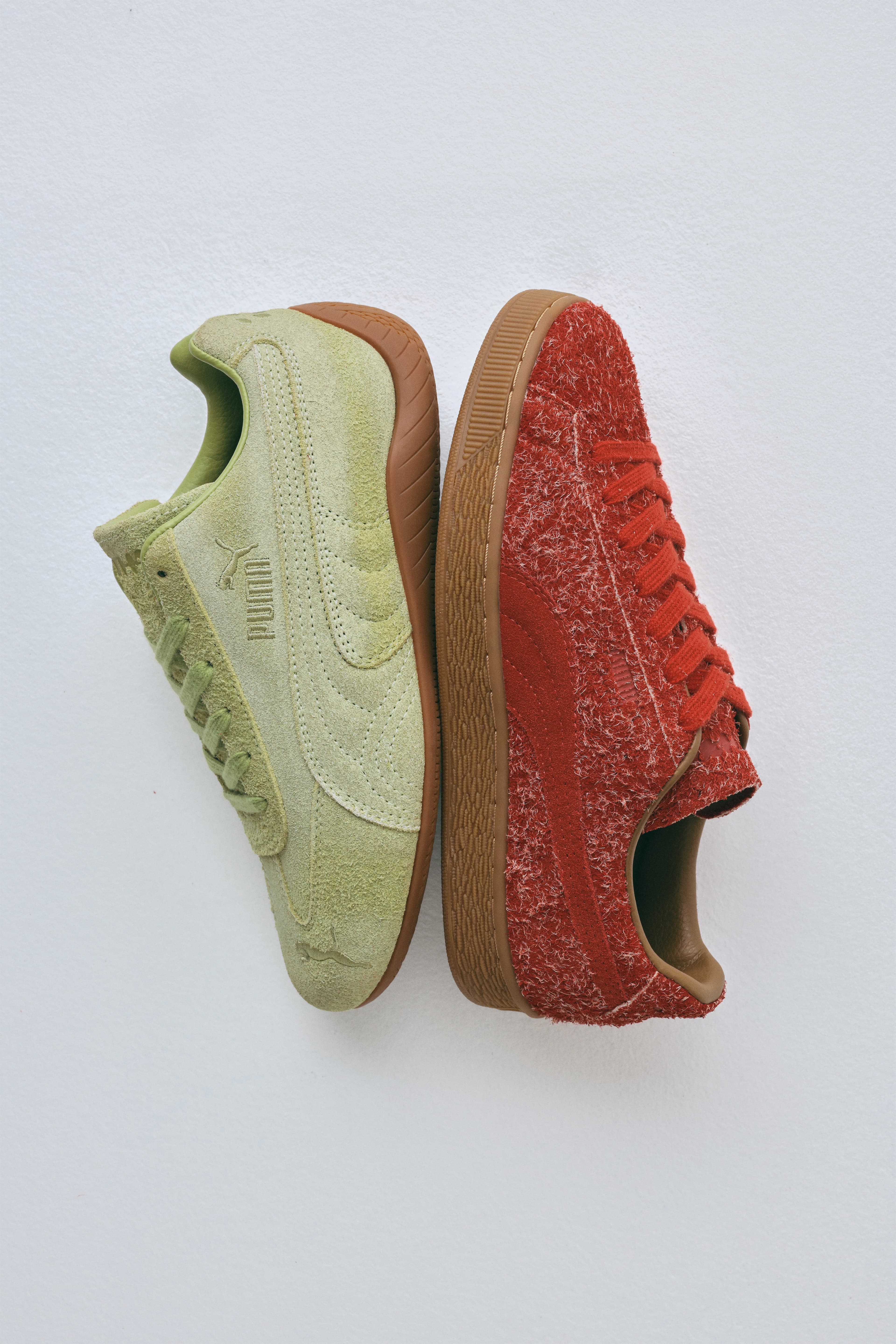 Danielle Cathari teams up with PUMA for her first-ever collaboration with the brand, reworking two classics: the Danielle Cathari x PUMA Suede Fuzzy 'Mars Red' and the Speedcat Washed 'Pistachio Green'.