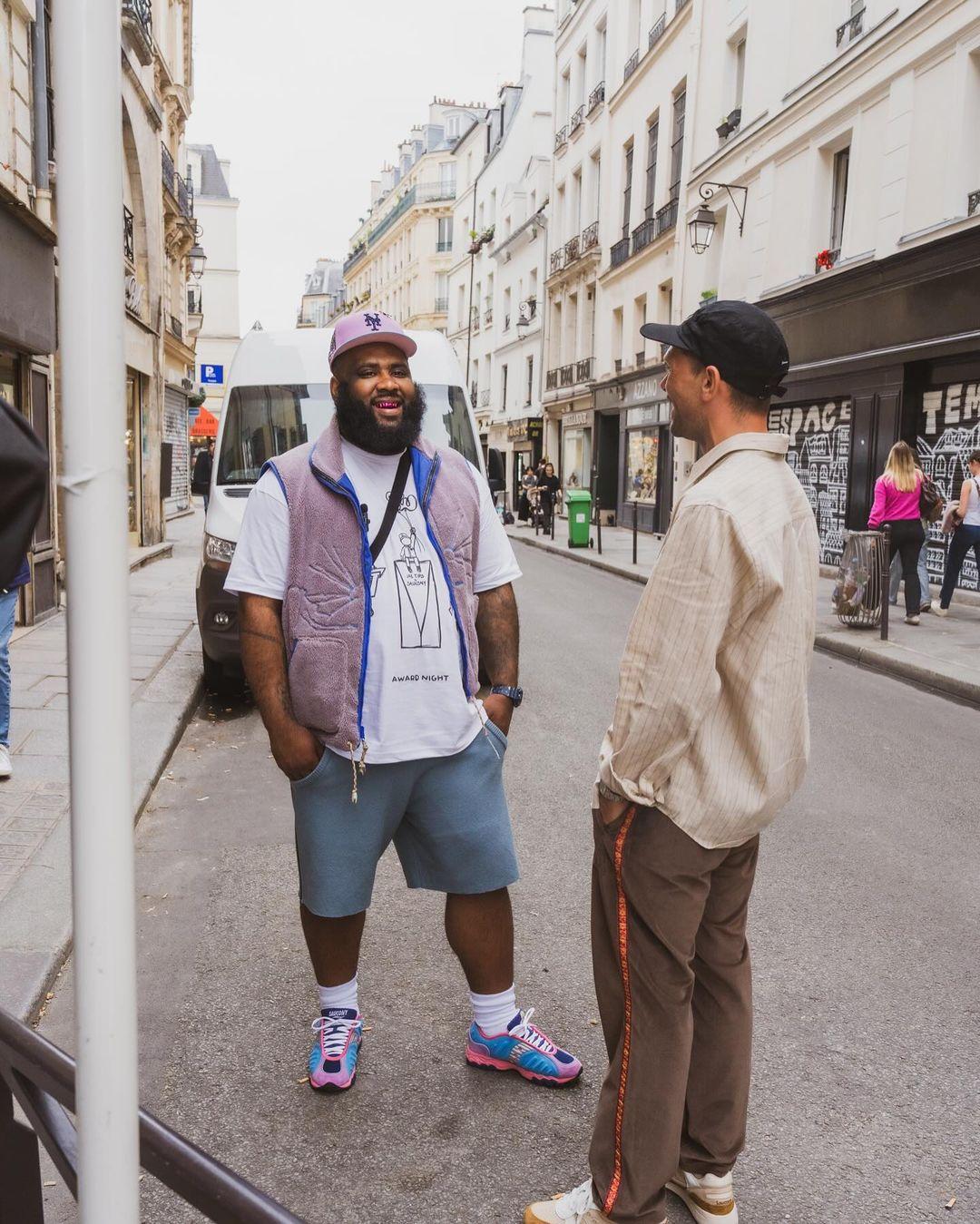During Paris Fashion Week that took place last week, Jae Tips was spotted in two colorways of a previously unused silhouette; the Saucony Matrix. The sneaker appeared in a burgundy and a pink and blue colorway. Like his previous collabs, these two sneakers use a lot of color.