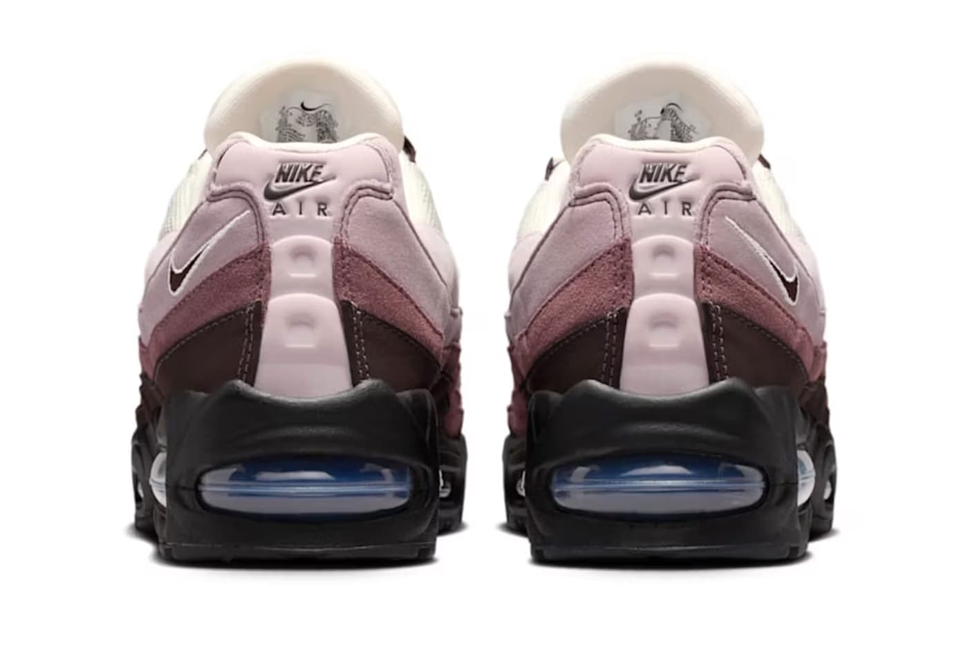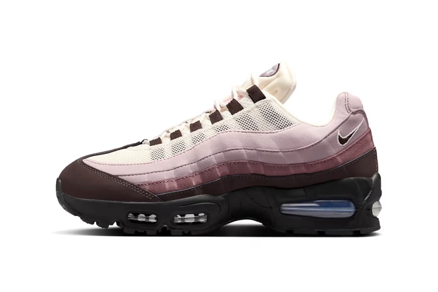 The shoe features the familiar construction, with a mesh upper dressed in leather, wavy overlays. Like many recent Air Max 95 releases, this version also comes equipped with a ‘Big Bubble’. The colorway consists of a refined gradient of Black, Velvet Brown, and Light Violet Ore.