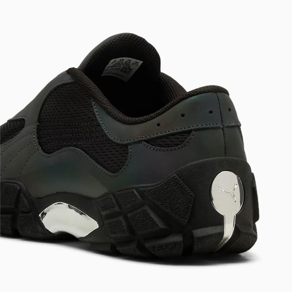 At first glance, the design appears simple, with a black upper. But looks can be deceiving, as reflective overlays have been applied over the upper. These overlays wrap around the entire shoe, revealing abstract black mesh perforations underneath.
