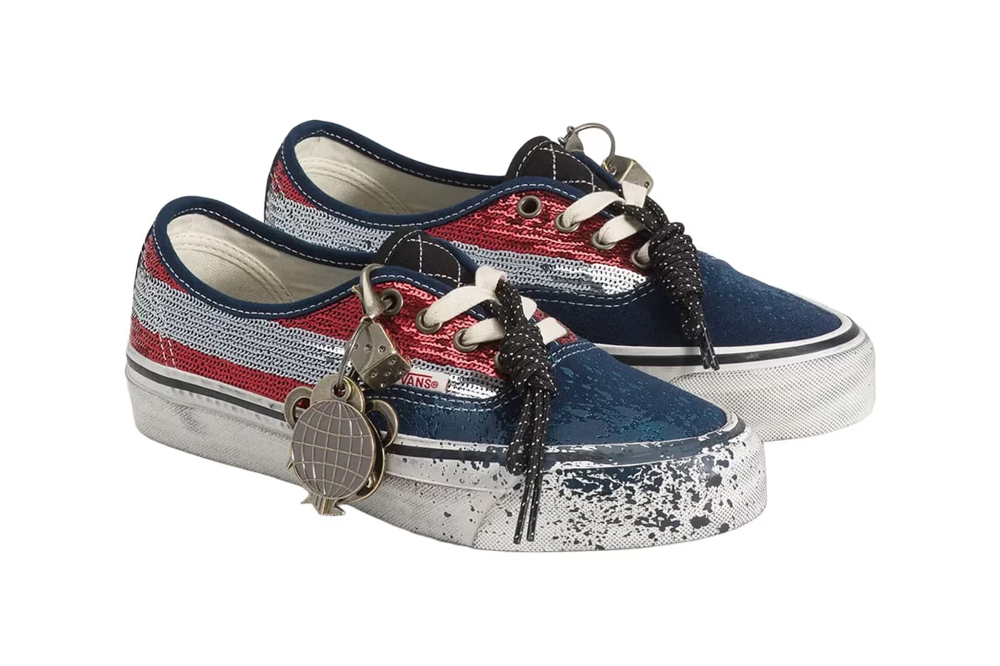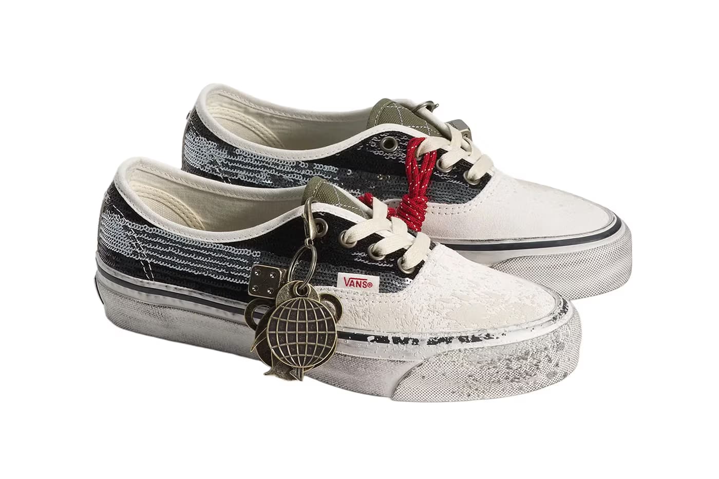 The sneakers feature striped sequins along the sides, a canvas upper, and playful details such as paint splatters on the toe box and a pre-distressed midsole. The latter, in particular, is something we’ve been seeing more and more from Vans lately, especially within their Premium line (ironically enough).