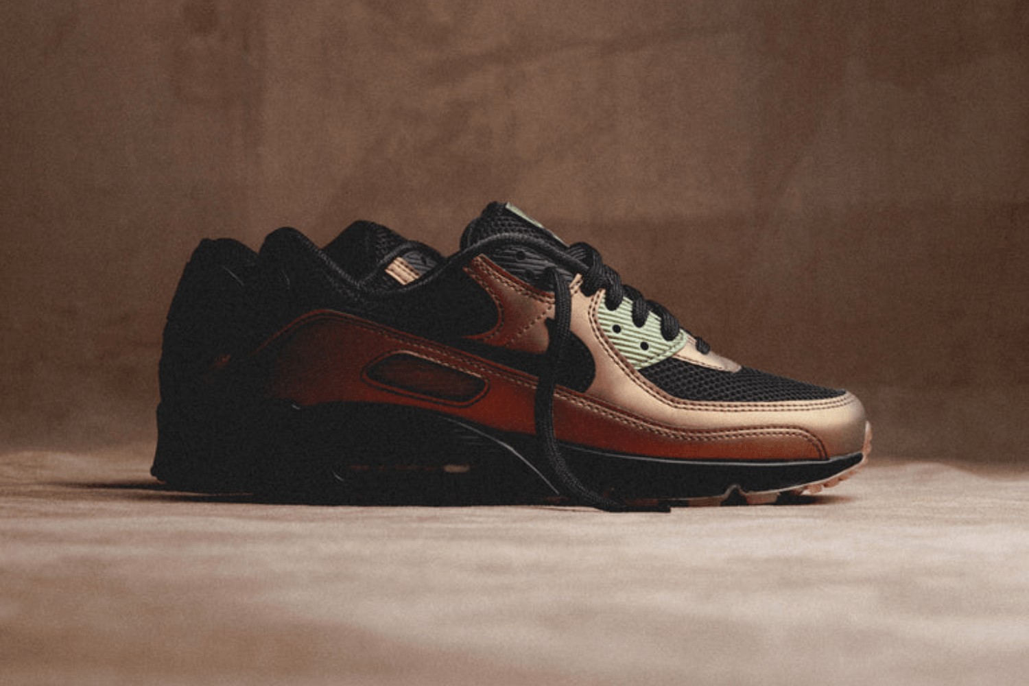 The low-key colorway featured a black mesh base, with four layers of matte dark-grey leather curving from toe to heel. The Nike Swoosh appeared in Metallic Red Bronze, with the same colour accented on the heel. The black midsole rounded off the darker look.