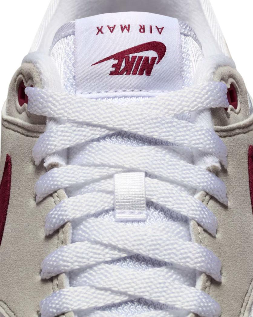 For this collaboration, the Air Max 1 comes in a ‘Team Maroon’ colorway, applied to the otherwise classic colorblocking. White mesh and grey overlays form the base, while ‘Maroon’ adds flare to the mudguard and other details on the sneaker. The inverted Nike branding on the tongue and heel references ‘The Upside Down,’ one of the iconic elements from the series.