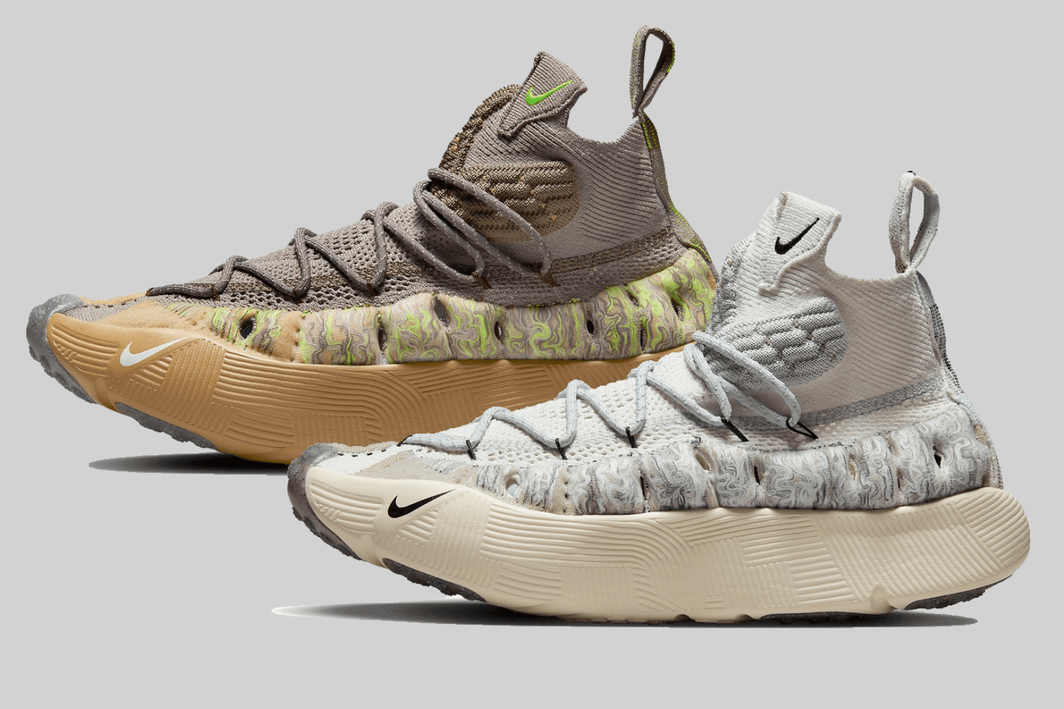 The âEnigma Stoneâ utilises a rather intense colorway with a marbled neon green pattern on the midfoot separating a brown and stone upper from a gum sole.