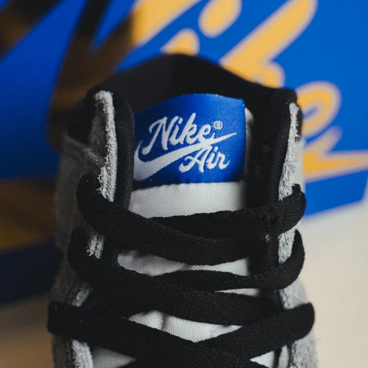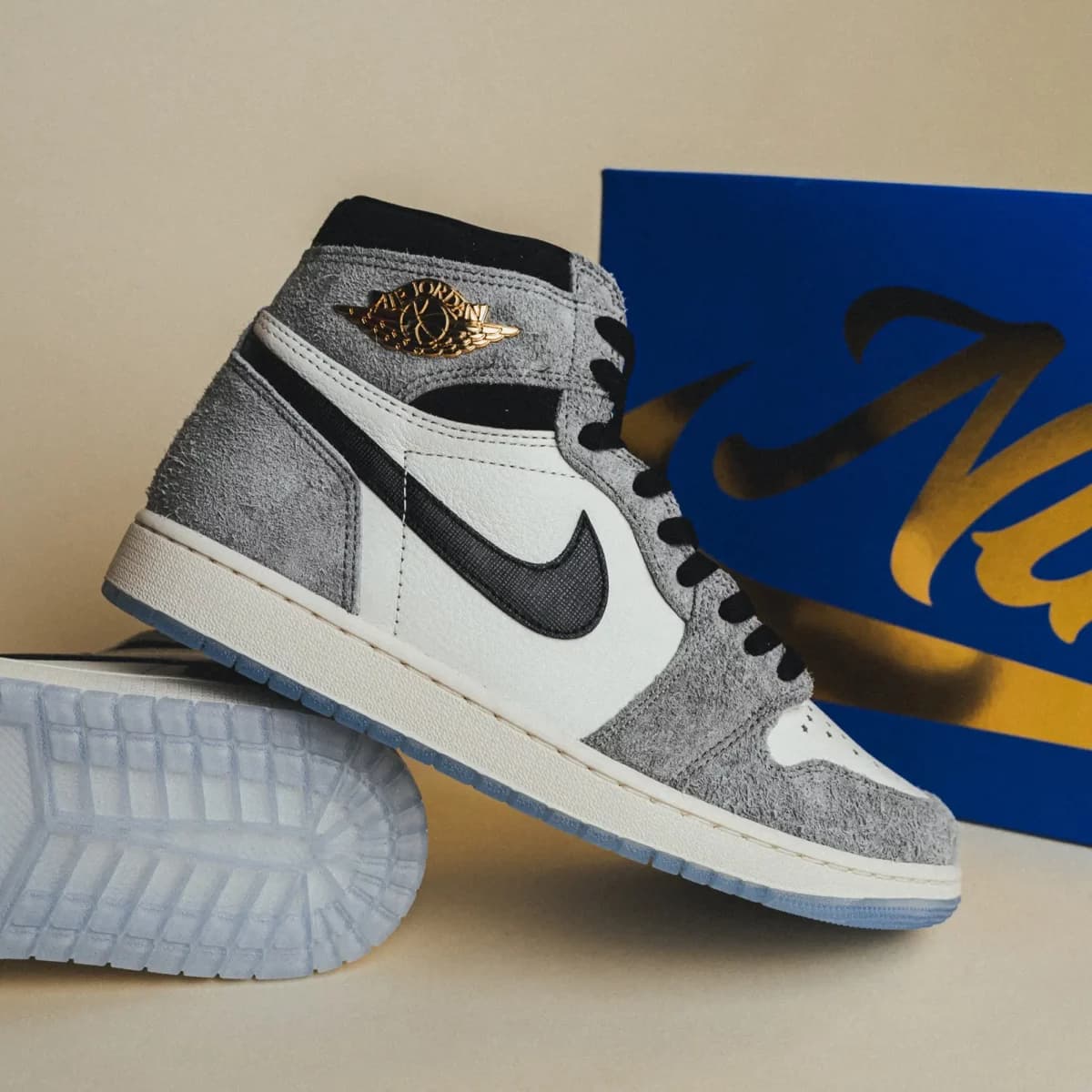 Het bovenwerk bestaat uit een combinatie van leer en suède. De underlays bestaan uit wit leer terwijl de overlays in ‘Cool Grey’ suède komen. Eén van de opvallende details is het gouden Wings-logo, iets wat de redelijk rustige AJ1 een extra twist geeft. Ook is het tonglabel dit keer uitgevoerd in een iets sierlijkere stijl dan normaal.
