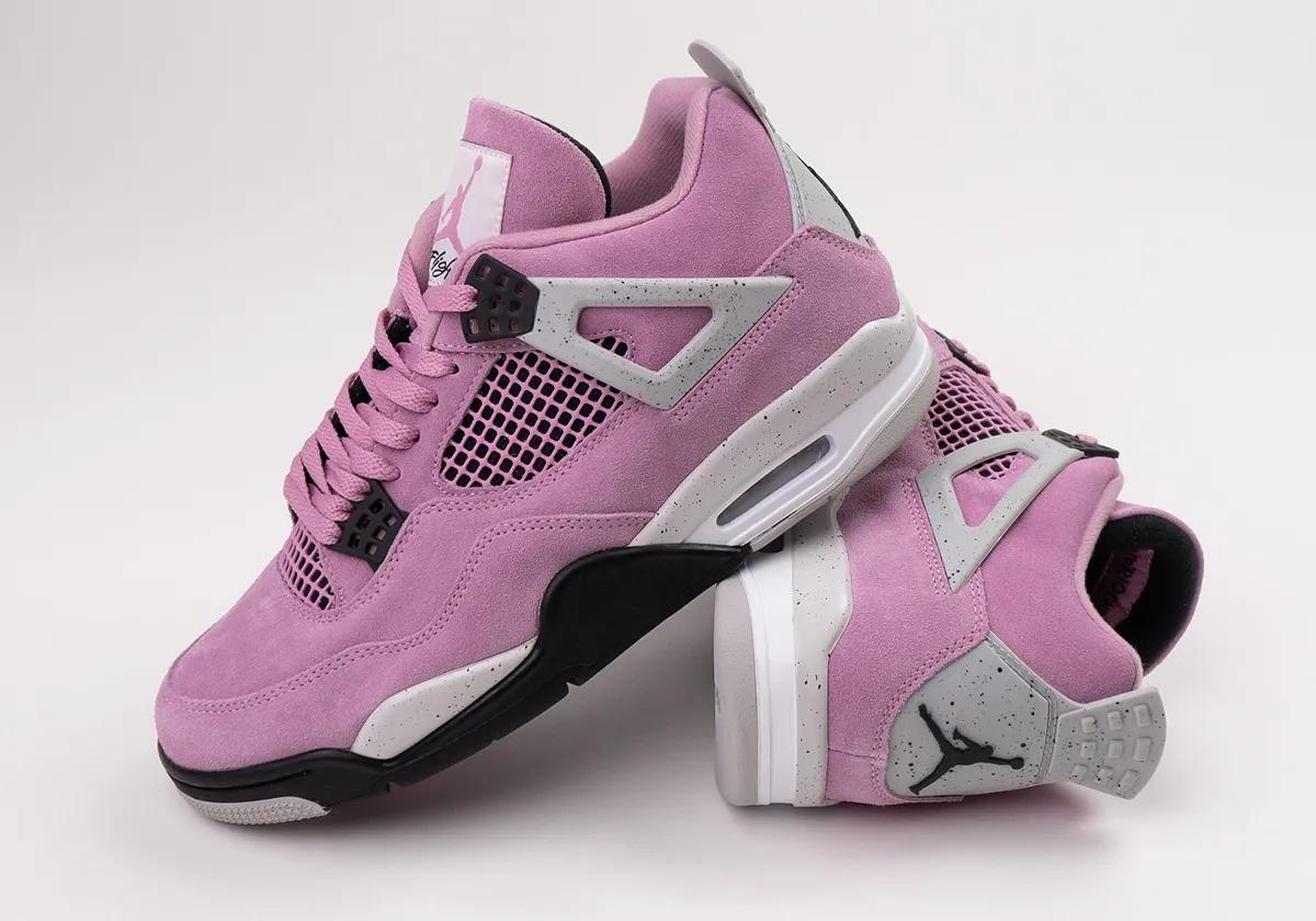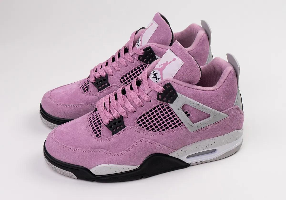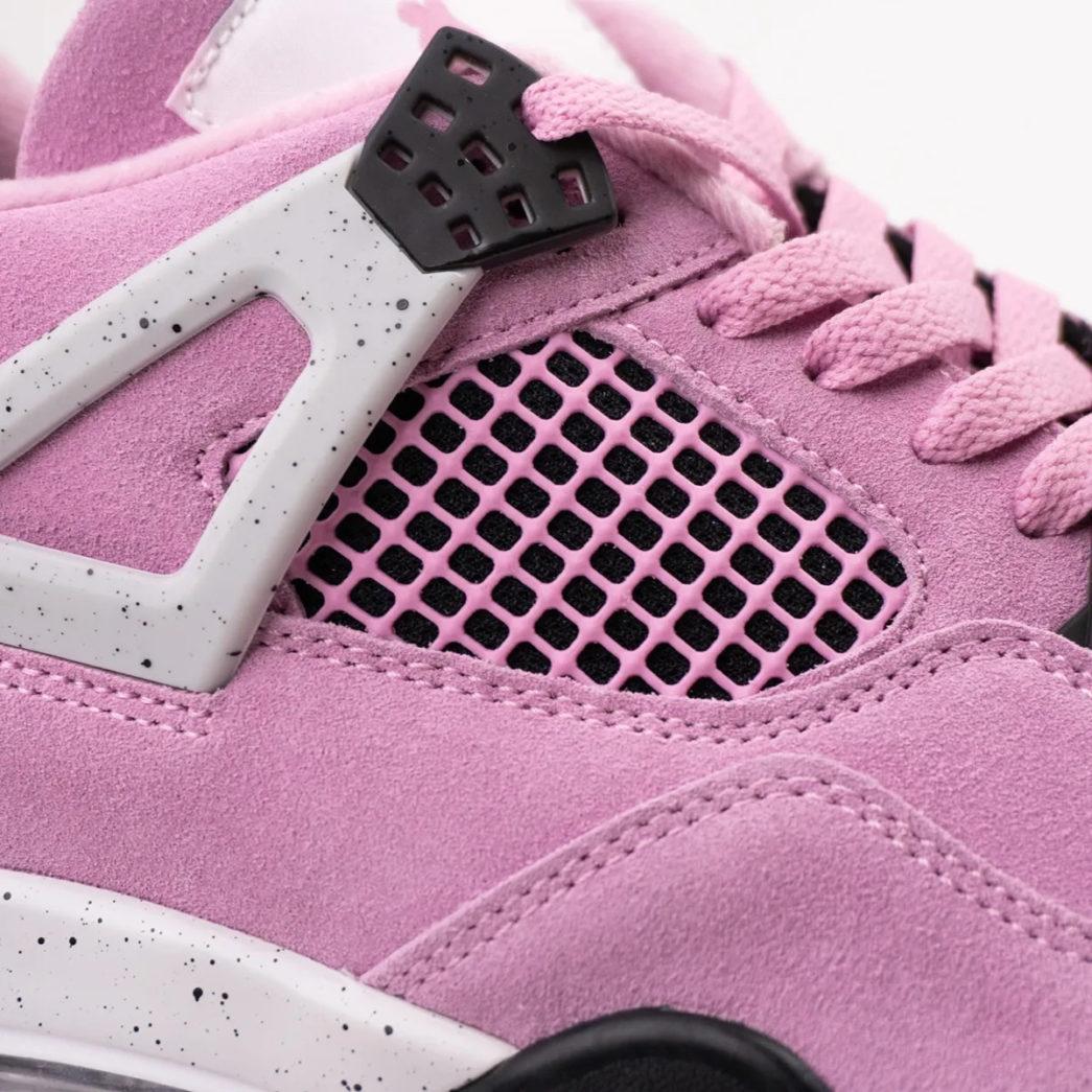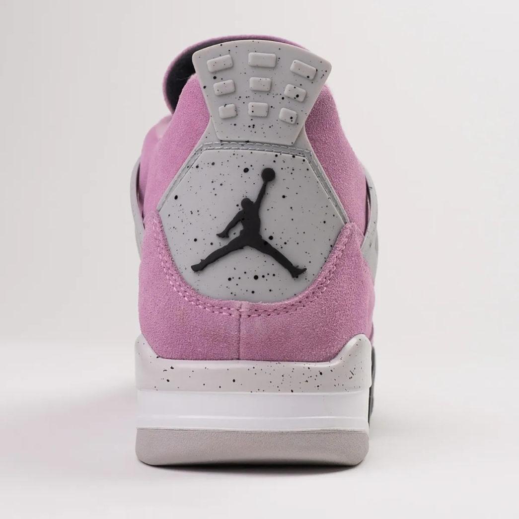 De Air Jordan 4 WMNS ‘Orchid’ heeft een roze upper gemaakt van suède. Het design gebruikt grijze details, zoals het embleem op de hiel en de Wings bij de veters. Zwarte veterogen contrasteren mooi met de roze upper, evenals de zwarte buitenzool. Op de tong is het Jumpman logo geplaatst. Deze verschijnt ook op de hiel en op de middenzool.