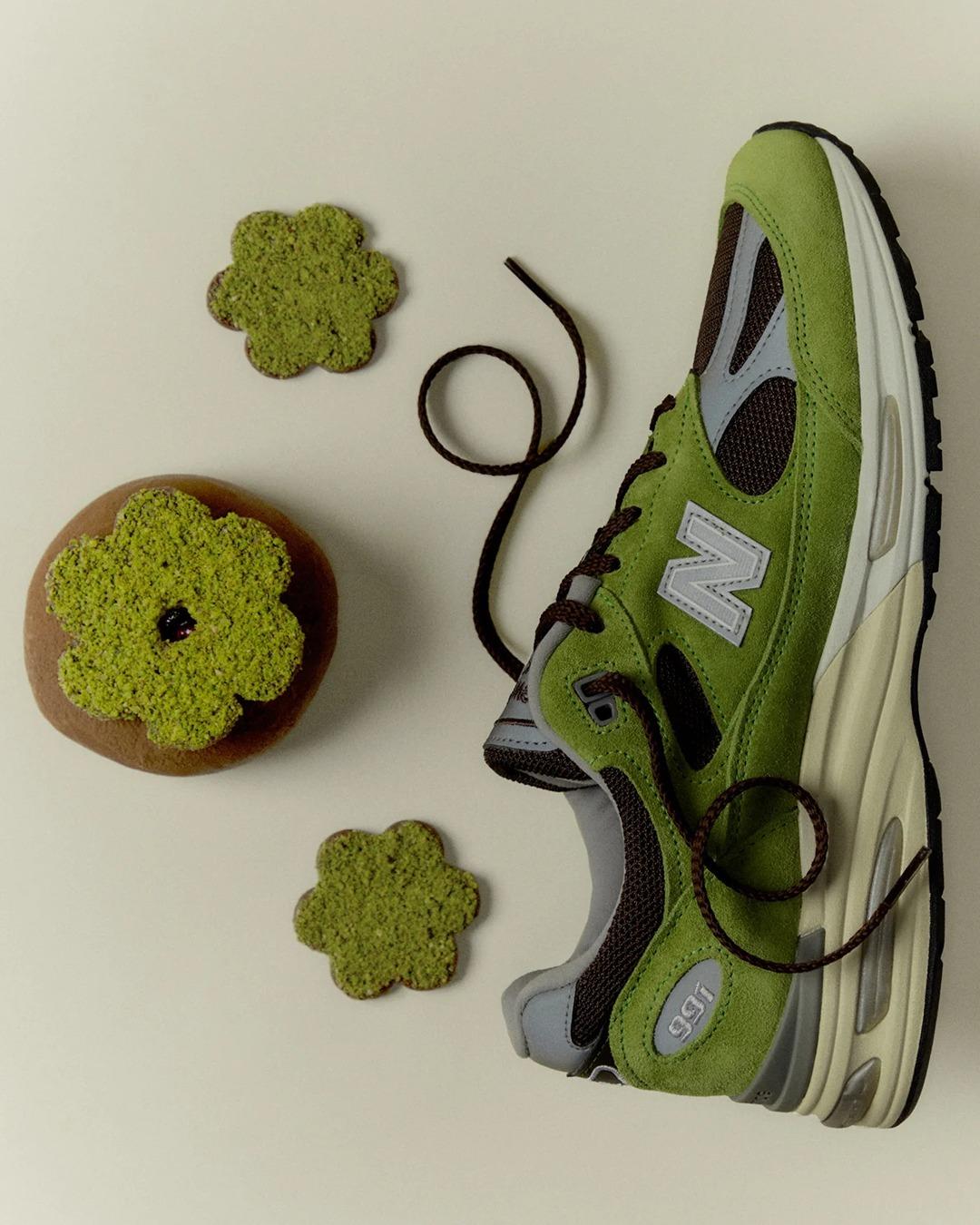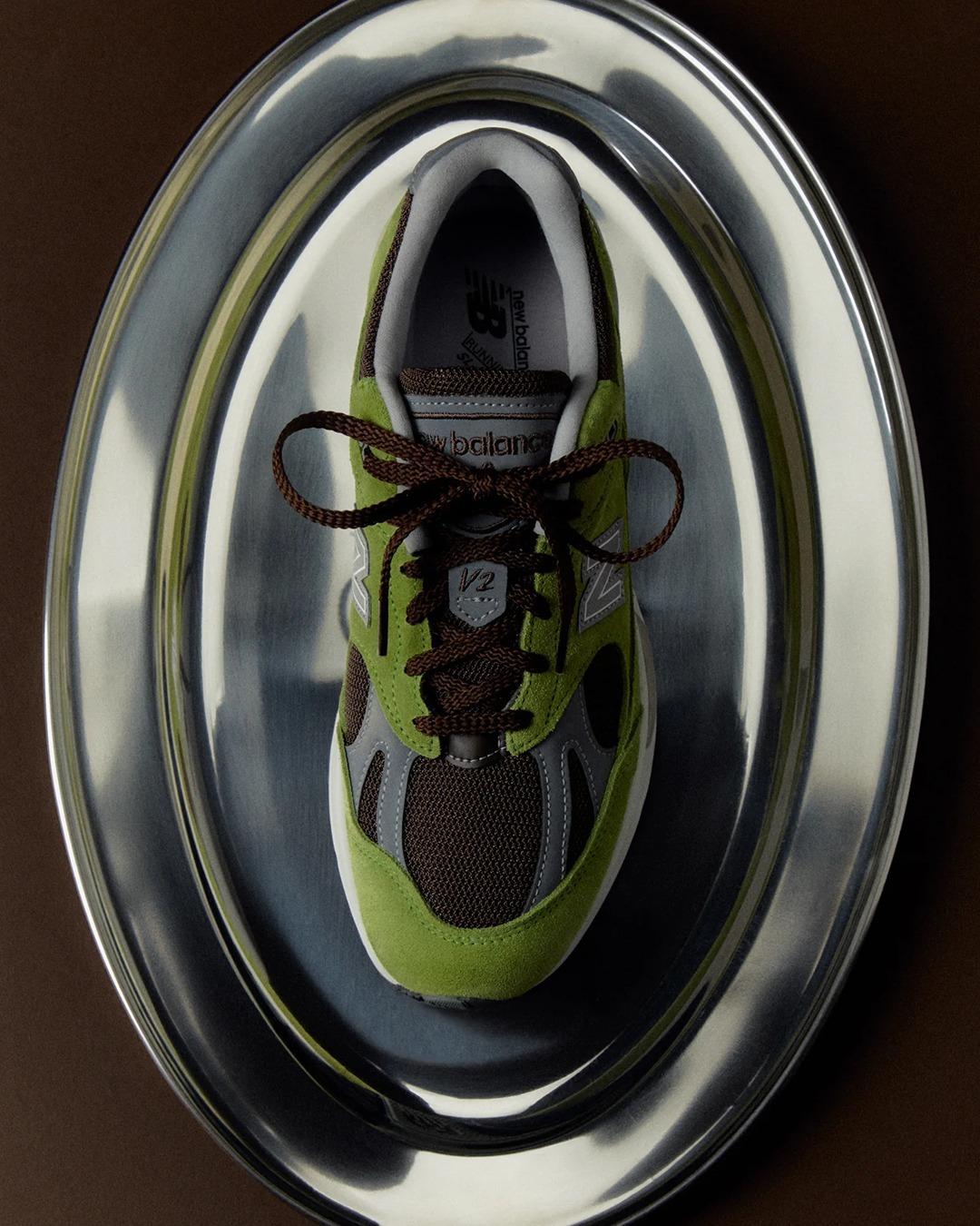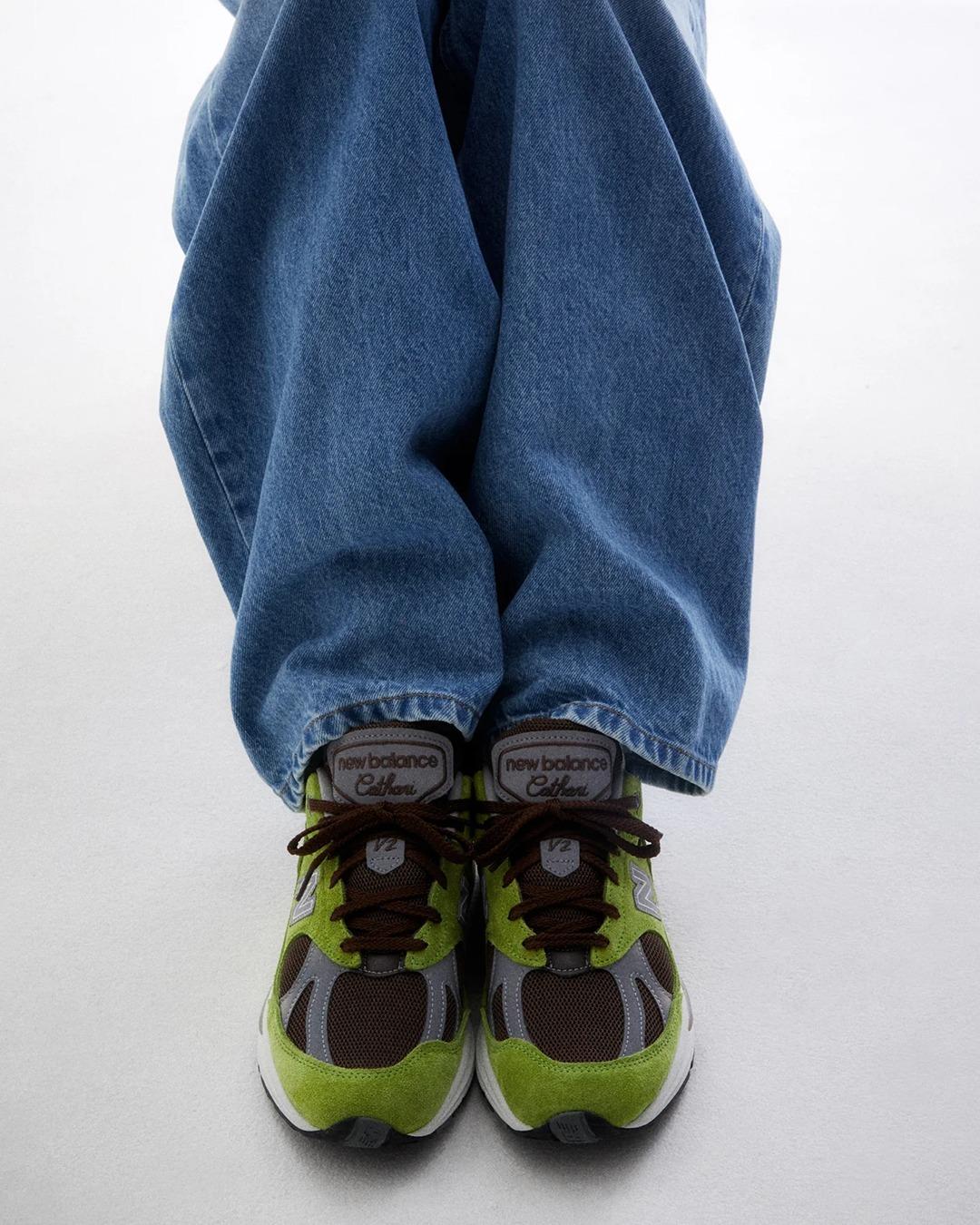 De 991v2, normaal gesproken bekend om zijn in-line basiskleuren, ondergaat een opvallende make-over onder invloed van Cathari’s visie. Het suède bovenwerk krijgt een weelderige mosgroene tint, terwijl het donkerbruine mesh zorgt voor een aards contrast. Het kleurenpalet lijkt geïnspireerd te zijn op matcha-dusted chocoladelekkernijen, zoals te zien is op Cathari’s Instagram-carrousel.