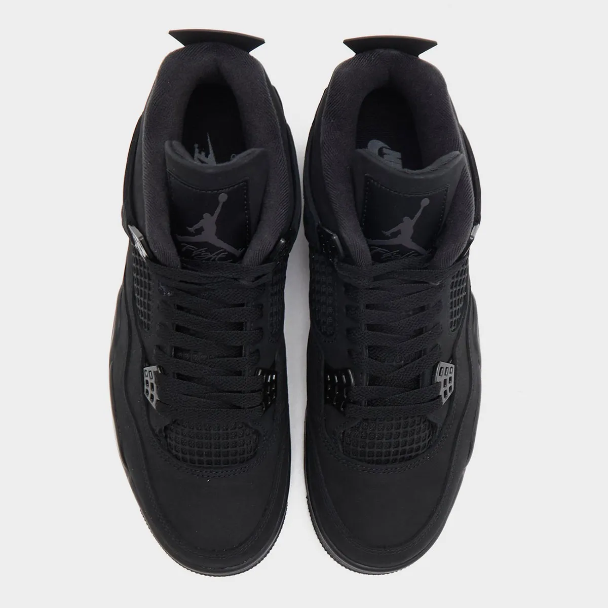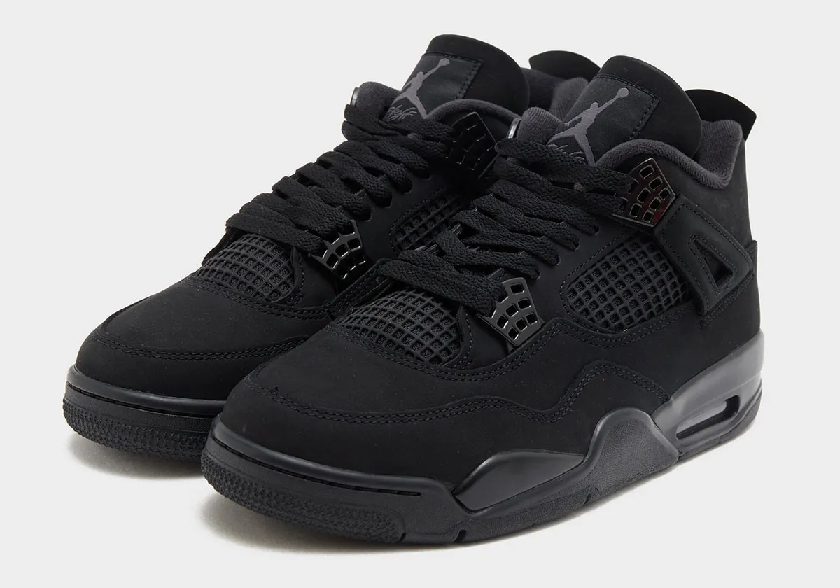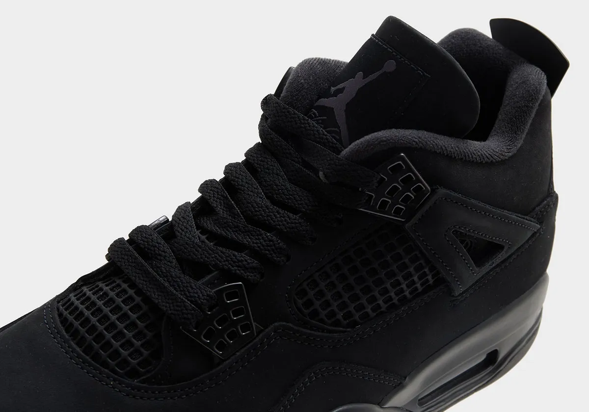 De versie van de ‘Black Cat’ Air Jordan 4 in 2025 krijgt enkele opvallende updates. Het grootste verschil is het Nike Air-logo op de hiel. Verder blijft het ontwerp trouw aan de originele stijl met zwart nubuck bovenwerk, zwarte netstructuur en een zwarte middenzool. Ook bevat de sneaker Light Graphite accenten op het Jumpman-logo en een glanzende afwerking op de middenzool.