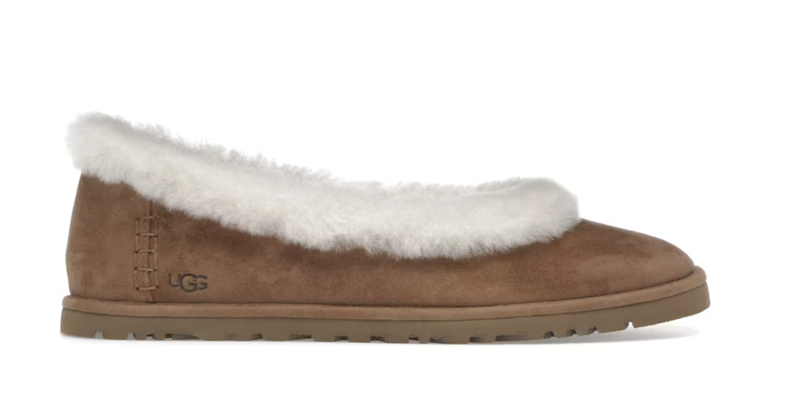 We starten met een klapper. De Zora Ballet Flat is een van de recentste silhouetten van het Amerikaanse merk. De ballerina heeft een laag instapmodel en is gevoerd met de befaamde, geliefde schapenvacht. Ook is de zool dunner dan bij de klassieke UGG boots.