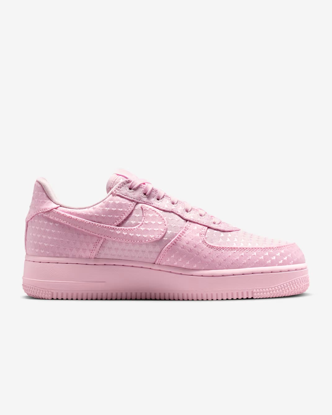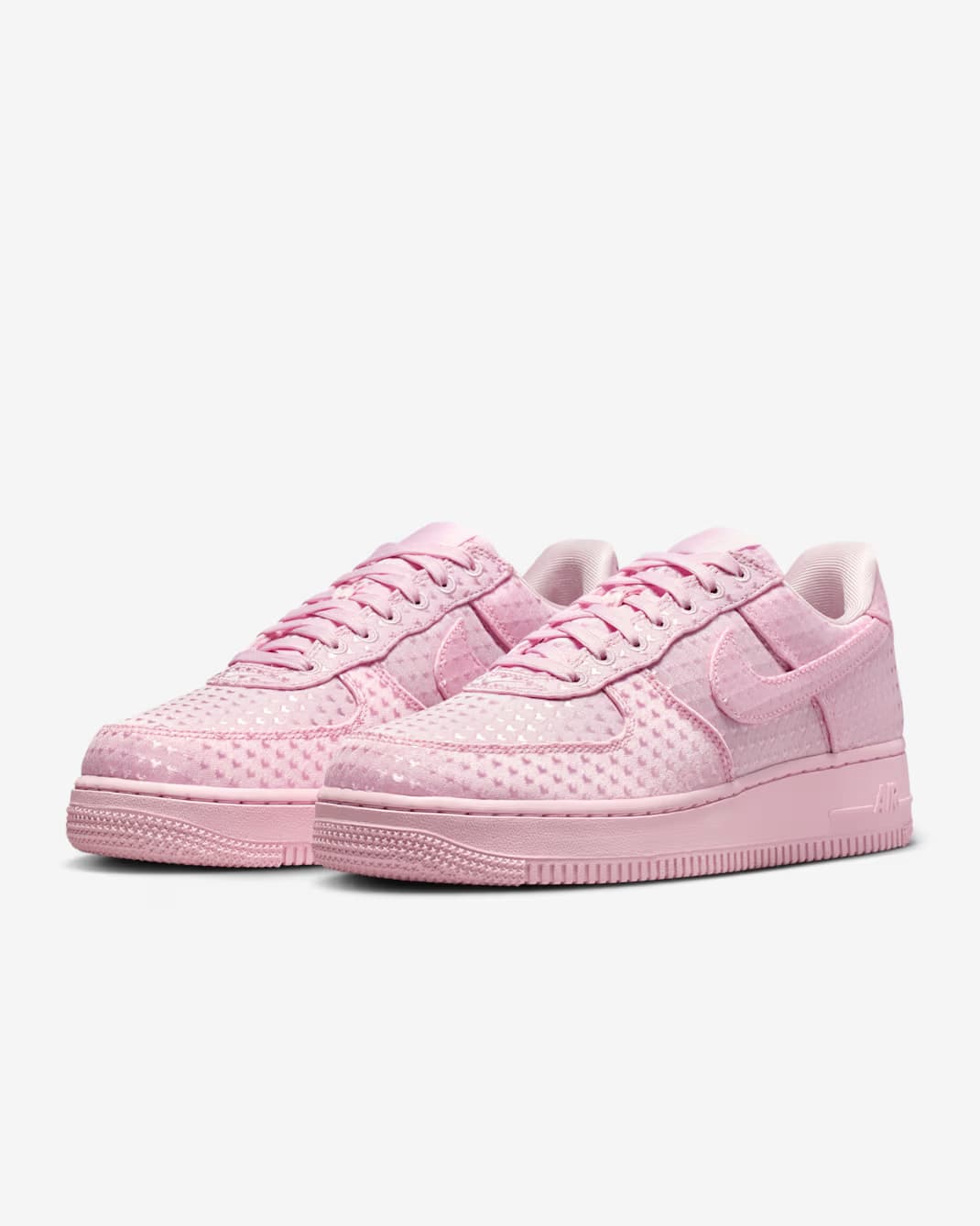 Het gaat hier om twee nieuwe colorways uit het Nike Air Force 1 ‘Valentine’s Day’ pack: ‘Pink’ en ‘University Red’. Beide uitvoeringen hebben een monochromatische uitstraling, gekenmerkt door een all-over print van kleine hartjes, net als bij de eerder getoonde zwarte colorway.