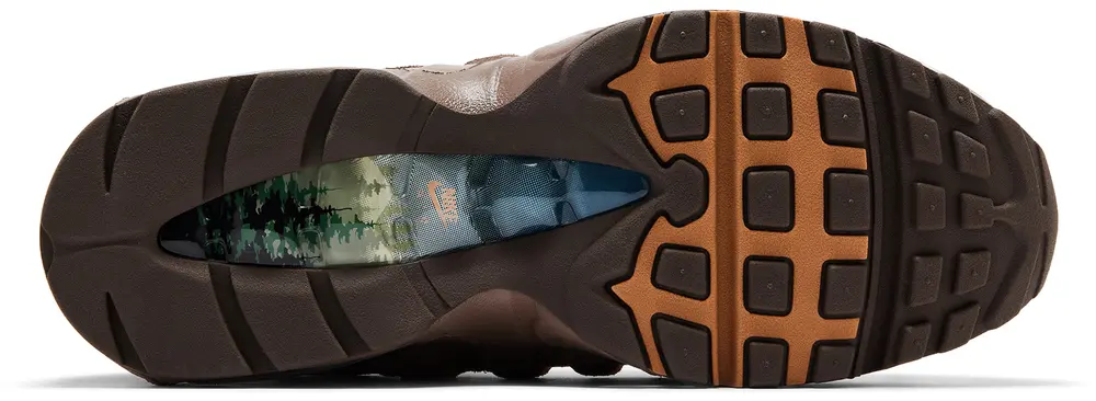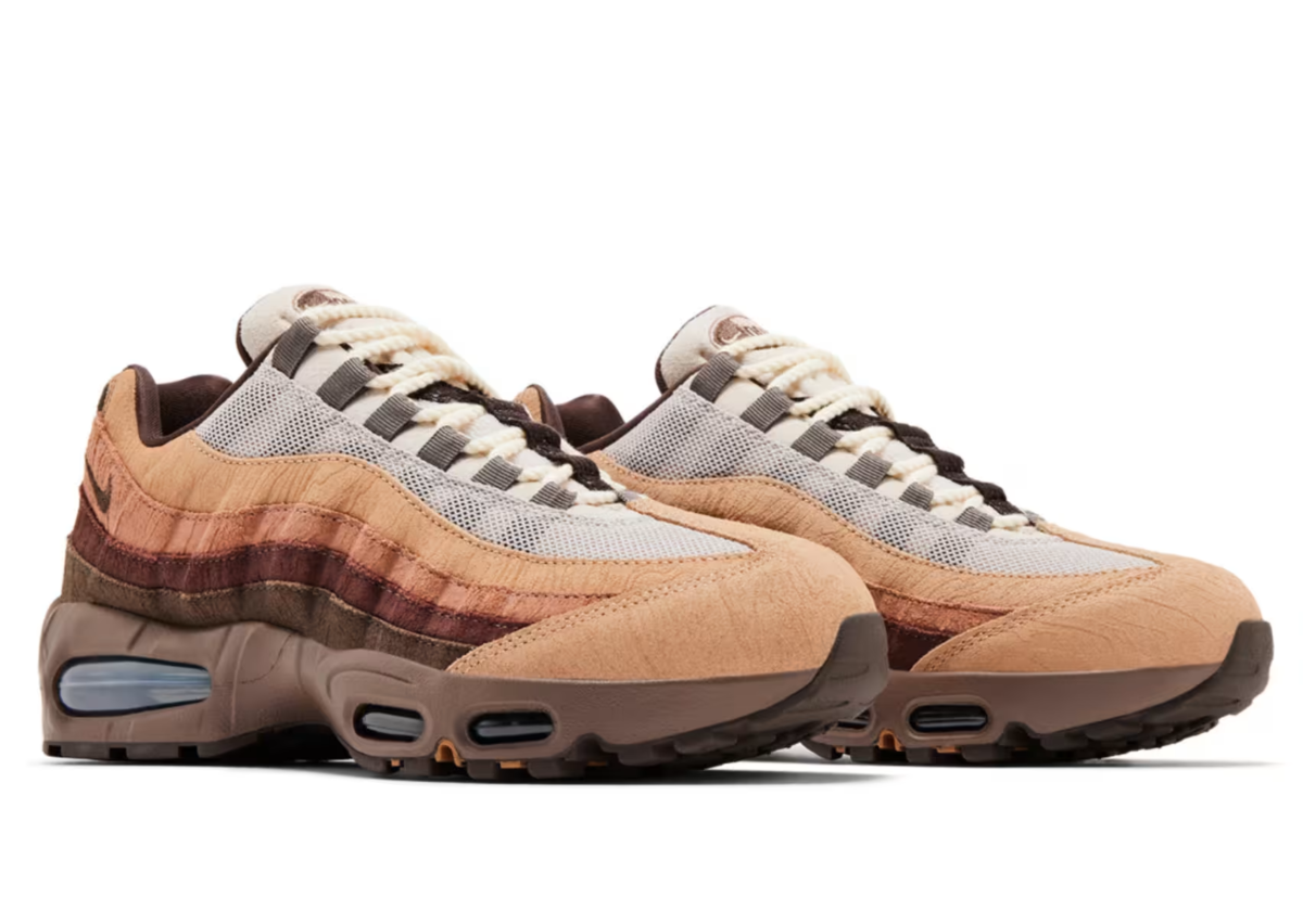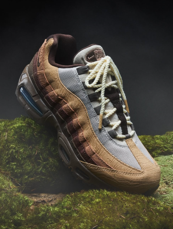 Voor deze release duikt DOAF dus diep in de texturen van de streek waar ze vandaan komen. De Nike Air Max 95 ‘Lumber Yard’ is een duidelijke referentie aan de houtindustrie, met suède overlays voorzien van een houtnerf-embossing en robuuste materialen over de hele upper. Rope laces versterken de ruige look, terwijl een “wood grain graphic” op de sockliner het thema verder doorzet.
