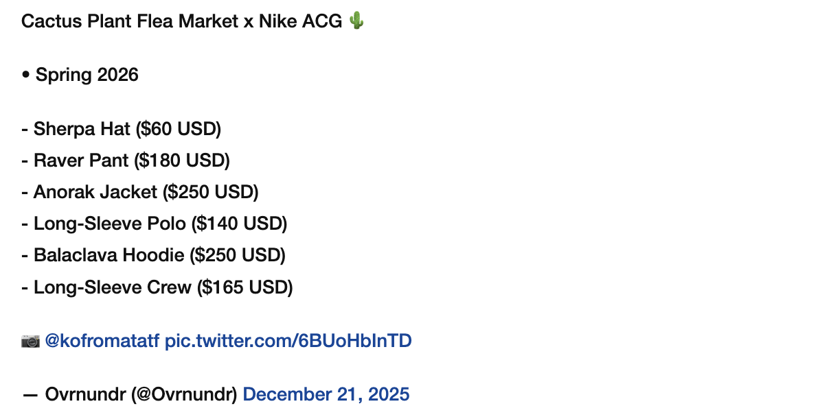 Cactus Plant Flea Market en Nike zijn al jaren verantwoordelijk voor de uniekste samenwerkingen. Denk hierbij aan de Grinch-achtige Air Force 1 release uit 2022 of de in Swarovski gehulde Dunk Low uit 2020. Voor Spring 2026 breiden Cynthia Lu en Nike hun samenwerking uit en ligt de focus op de Nike ACG-lijn.