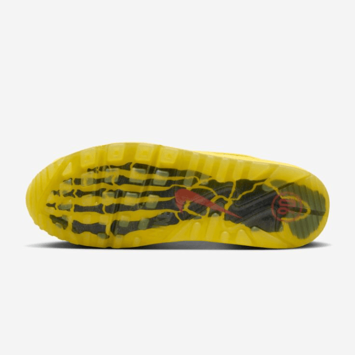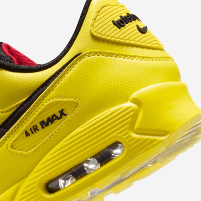 Er zit enorm veel nostalgie in de details. Het eerste silhouet in de collectie is de Air Max 90 ‘T90 Zest’. Fans van de mid-2000s zullen het opvallende geel-zwarte kleurenpalet direct herkennen, dat beroemd werd gemaakt door legendes als Wayne Rooney en Luís Figo.