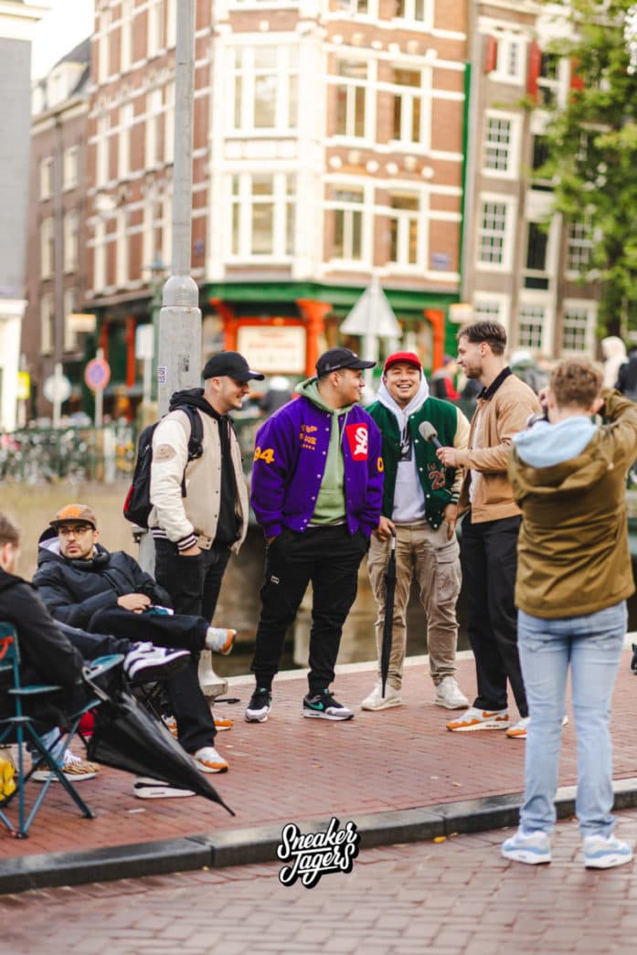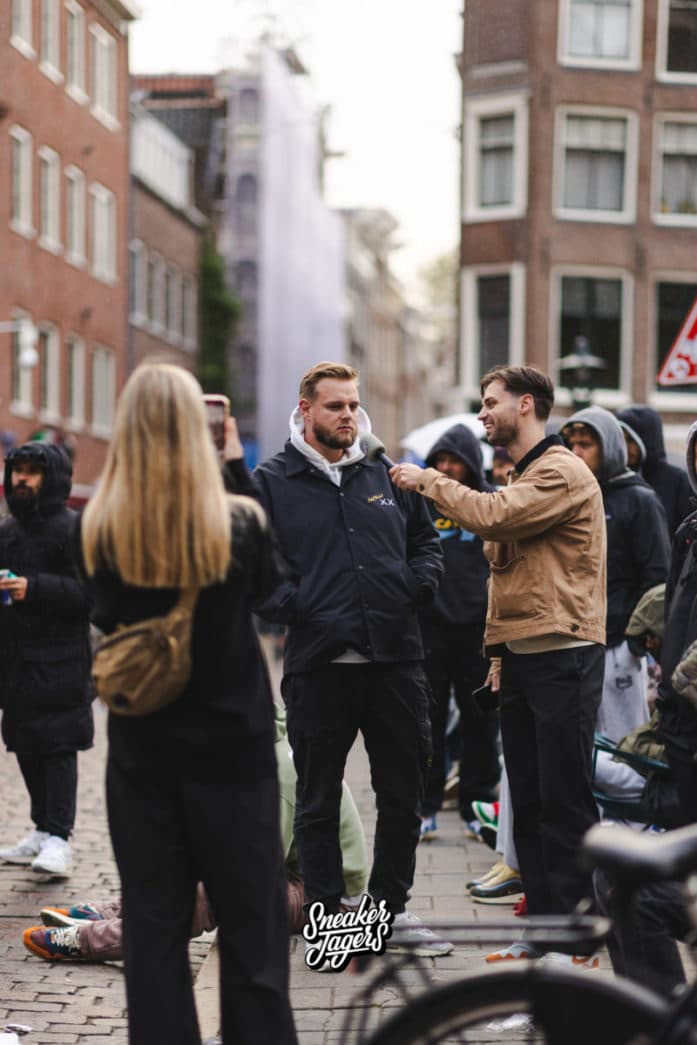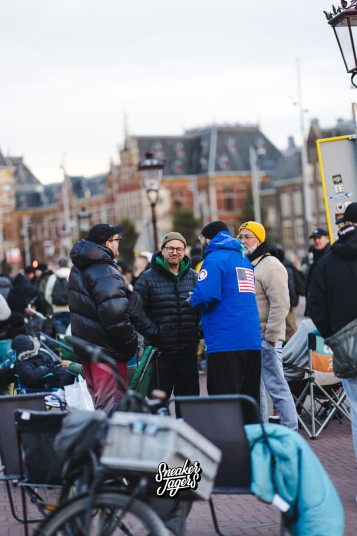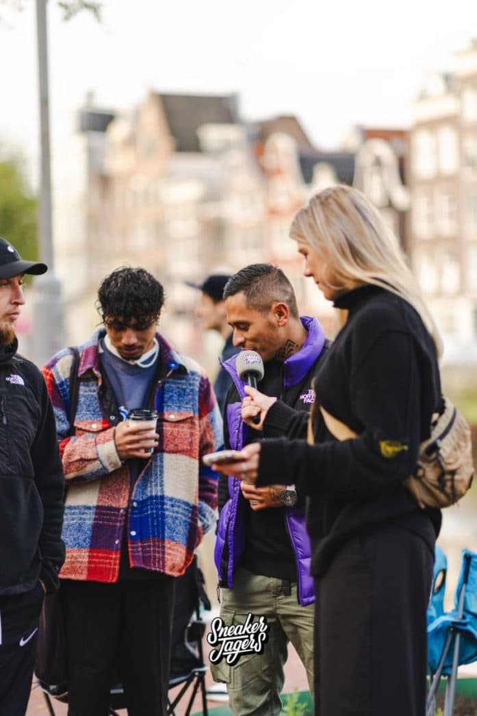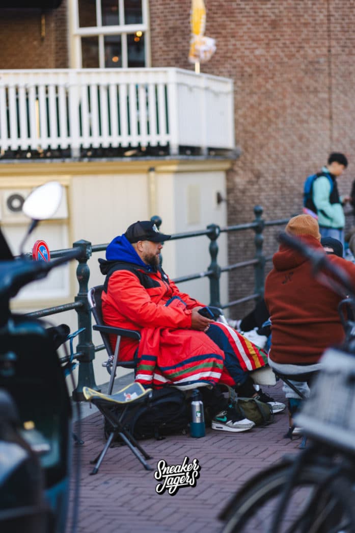 Sneakerjagers was ook aanwezig op de Zeedijk en sprak met mensen in de rij. Met kleine, slaperige ogen vertelden de voorsten in de rij dat ze al sinds woensdagmiddag aanwezig waren, zo’n 48 uur voor de release. Met campingstoelen, slaapzakken en de nodige blikjes Red Bull hielden ze zichzelf wakker in afwachting van de uiteindelijke drop van de sneaker.