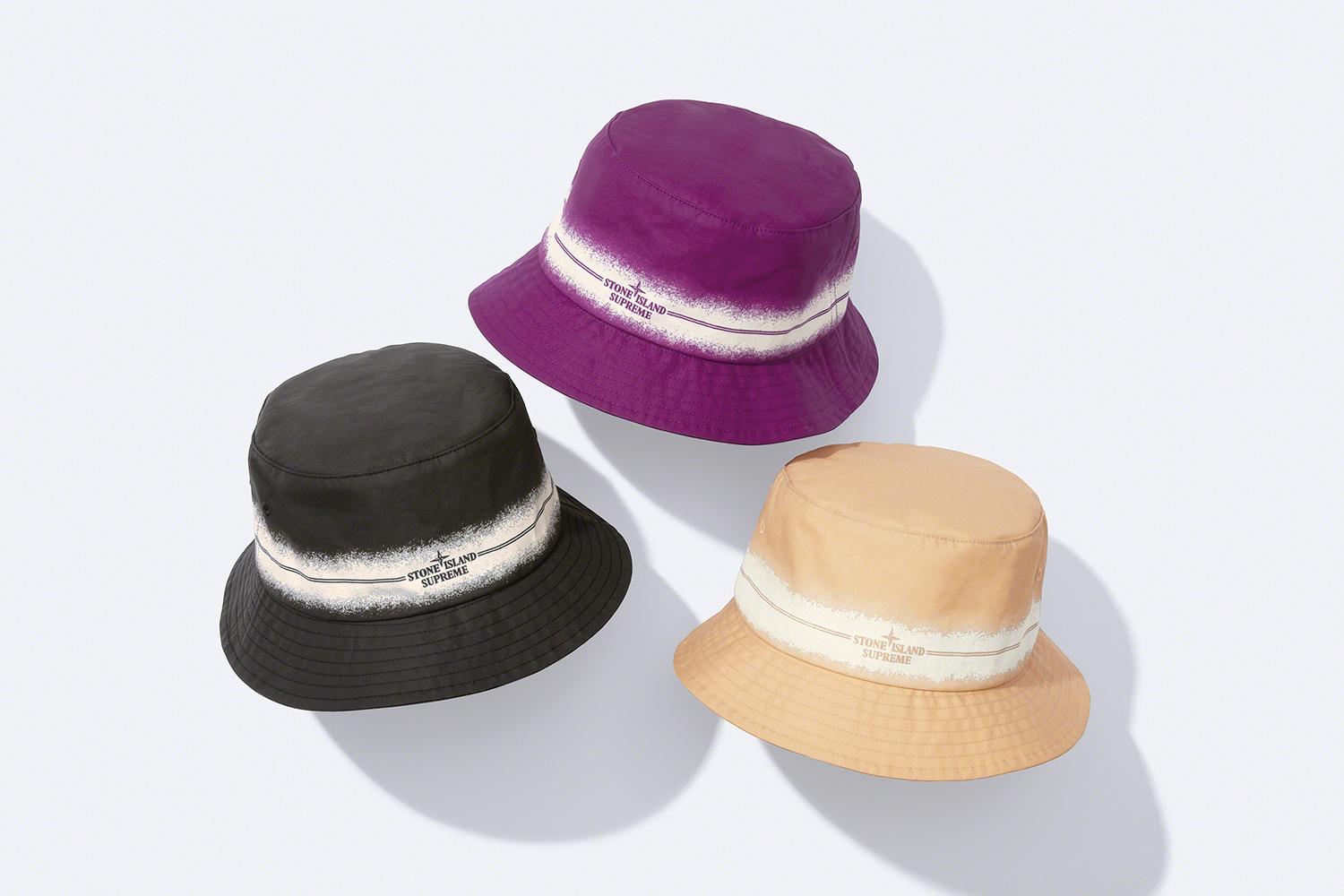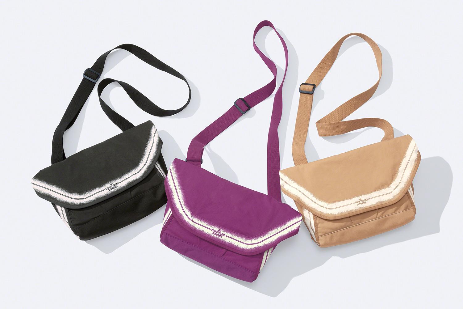 Verder bestaat de collectie uit cotton fleece sweatsuits die verkrijgbaar zijn in de kleuren zwart en , beige en magenta. Zowel de hoodie als de broek bevatten een Supreme logo en het iconische label van het Italiaanse Stone Island. Daarnaast zitten er ook nog t-shirts in vergelijkbare kleurstellingen, crusher hats en messenger bags in deze samenwerking. Bekijk de gehele collectie onderaan dit blog.